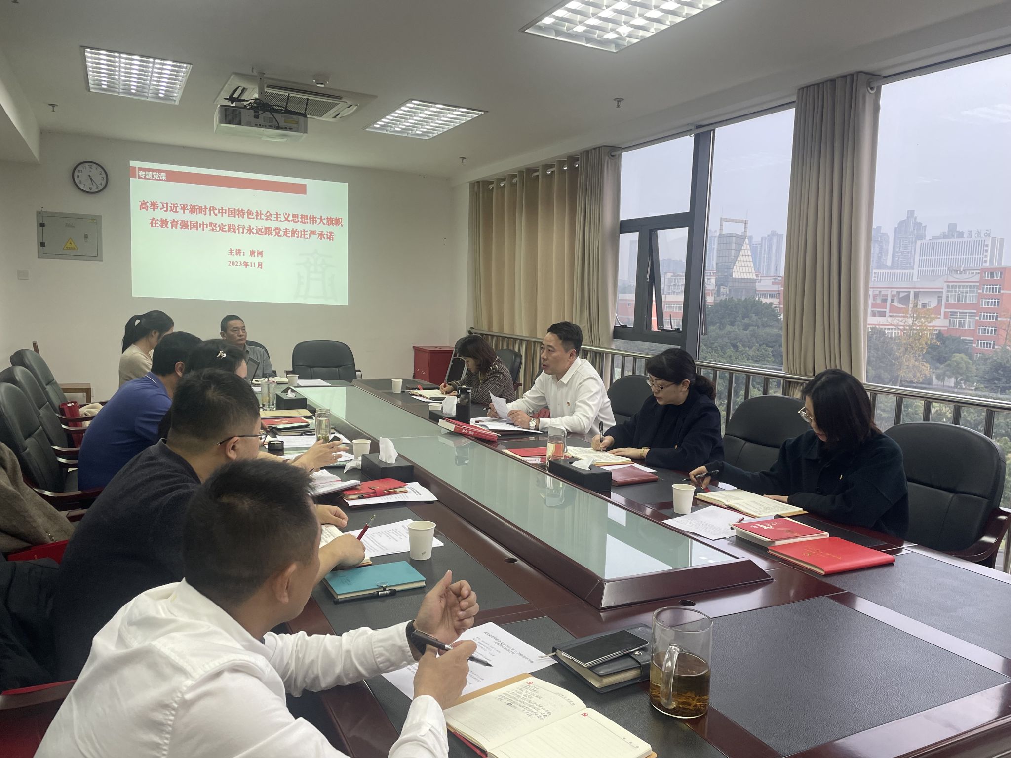 党支部唐柯同志以《高举习近平新时代中国特色社会主义思想伟大旗帜,在教育强国中坚定践行永远跟党走的庄严承诺》为题给支部党员讲授了党课。他从“在习近平新时代中国特色社会主义思想中认真汲取党的最新理论创新成果养分”“在事业发展进程中正确面对阶段性矛盾”“在教育强国中坚定践行永远跟党走的庄严承诺”等三个方面深入浅出地作了分享,希望支部每一位党员牢记入党的初心和誓言,深耕为民和家国的情怀;坚持系统思维,珍爱和平发展环境;坚持底线思维,应对百年未有之大变局的挑战,贡献出在中华民族伟大复兴中的教育强国力量。