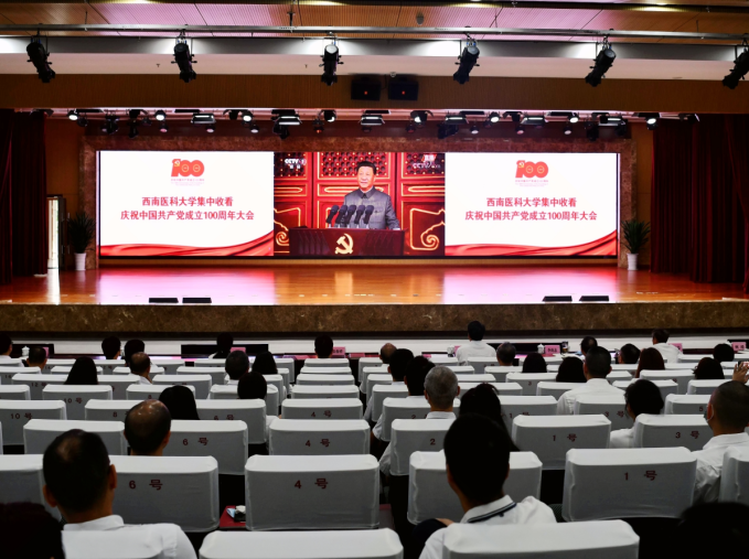 为隆重庆祝中国共产党百年华诞,学校党委组织广大师生员工收听收看庆祝中国共产党成立100周年大会。全体校级党委理论学习中心组成员、处级领导干部、学生辅导员,思想政治理论课教师、专业教师和学生代表在城北校区第一学术报告厅观看大会。各二级党组织组织本单位师生员工在会议室、办公室、教室、门诊等分会场通过电视、网络等观看大会。全校万余名师生共同见证了这一伟大时刻。