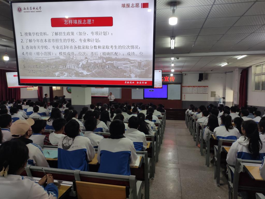 5月12日,昭觉中学、昭觉民族中学礼堂里座无虚席。beat365官方网站学生工作处招生办公室主任罗俊给两所中学校校领导、毕业年级班主任和高中学生共计700余人作高考志愿填报培训。
