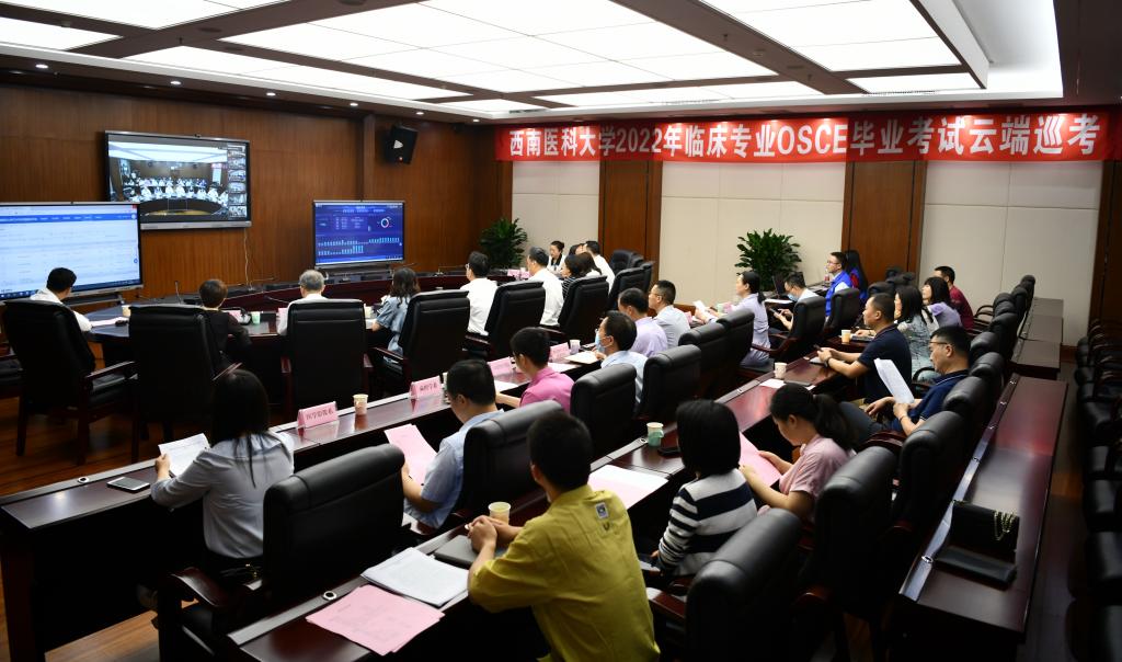 教务处处长郑小莉介绍此次考试的总体工作情况。学校党政领导分别与当日6个考点(绵阳市第三人民医院、乐山市人民医院、绵阳四0四医院、达州市中心医院、崇州市人民医院、德阳市第二人民医院)院领导视频连线,听取医院组织考试情况并对各教学基地精心组织考试予以肯定。
