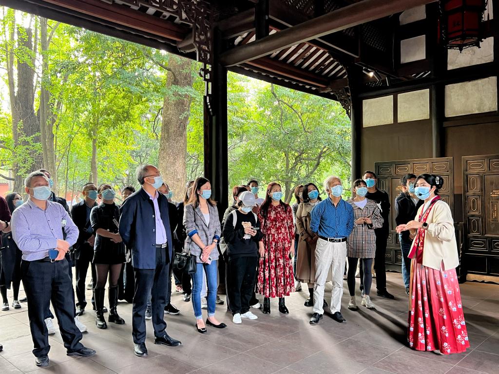 在全国爱国主题教育基地、全省廉洁文化基地——三苏祠,考察团一行聆听了关于习近平总书记亲临三苏祠视察时的动人情景,了解了“三苏”的文学成就,感悟“读书正业、孝慈仁爱、非义不取、为政清廉”的“三苏”家风精髓。