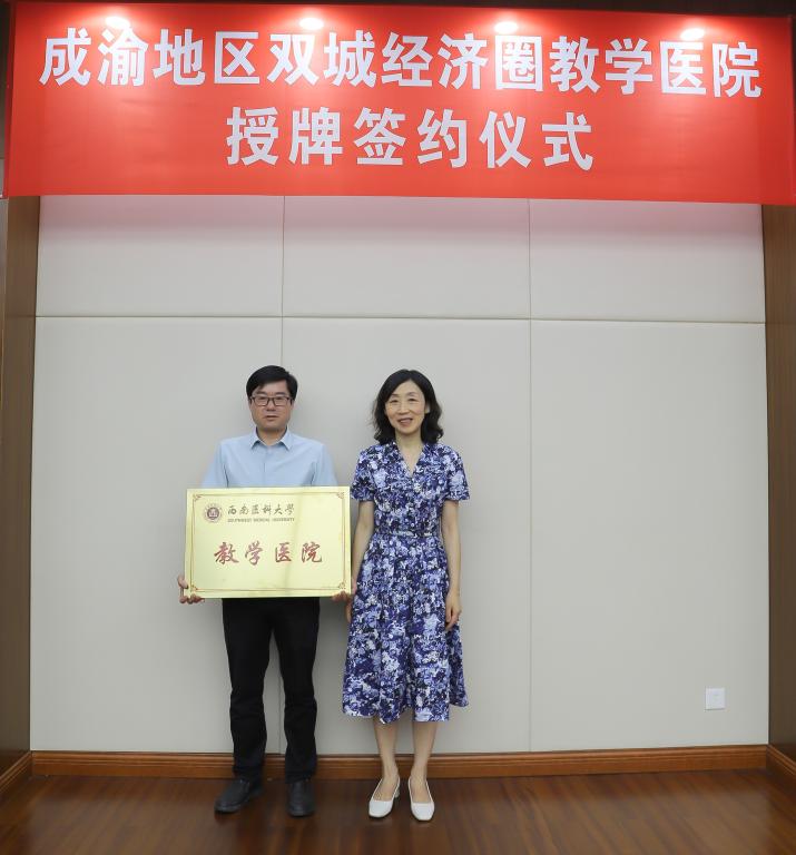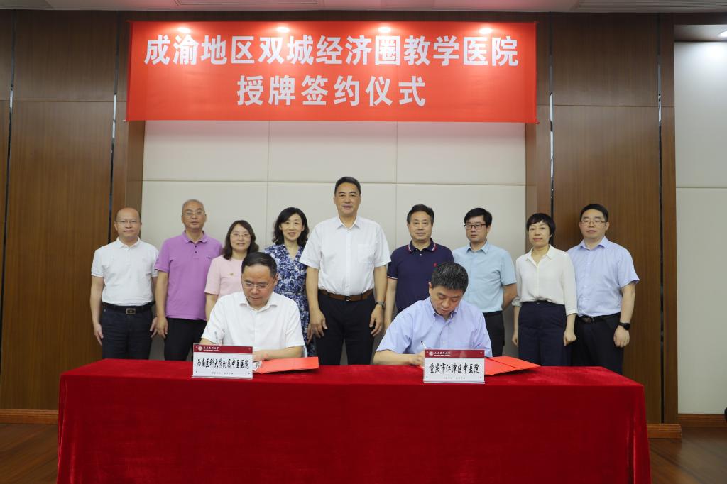 会上还举行了授牌和签约仪式。授牌仪式上,学校教务处处长郑小莉宣读了学校关于同意重庆市江津区中医医院增列为beat365官方网站教学医院的通知文件,何涛代表学校向江津区中医院授牌。签约仪式上,beat365官方网站附属中医医院与重庆市江津区中医院签署成渝地区双城经济圈建设一体化发展深度合作框架协议书。