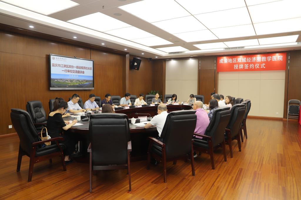 7月14日下午,学校与重庆市江津区政协杜长志一行在城北校区第一会议室举行交流座谈、授牌、签约。学校党委书记廖斌,党委常委、副校长何涛,党政办、教务处、科技处、研究生院、对外联络处、附属中医医院等部门领导出席了本次会议。会议由何涛主持。