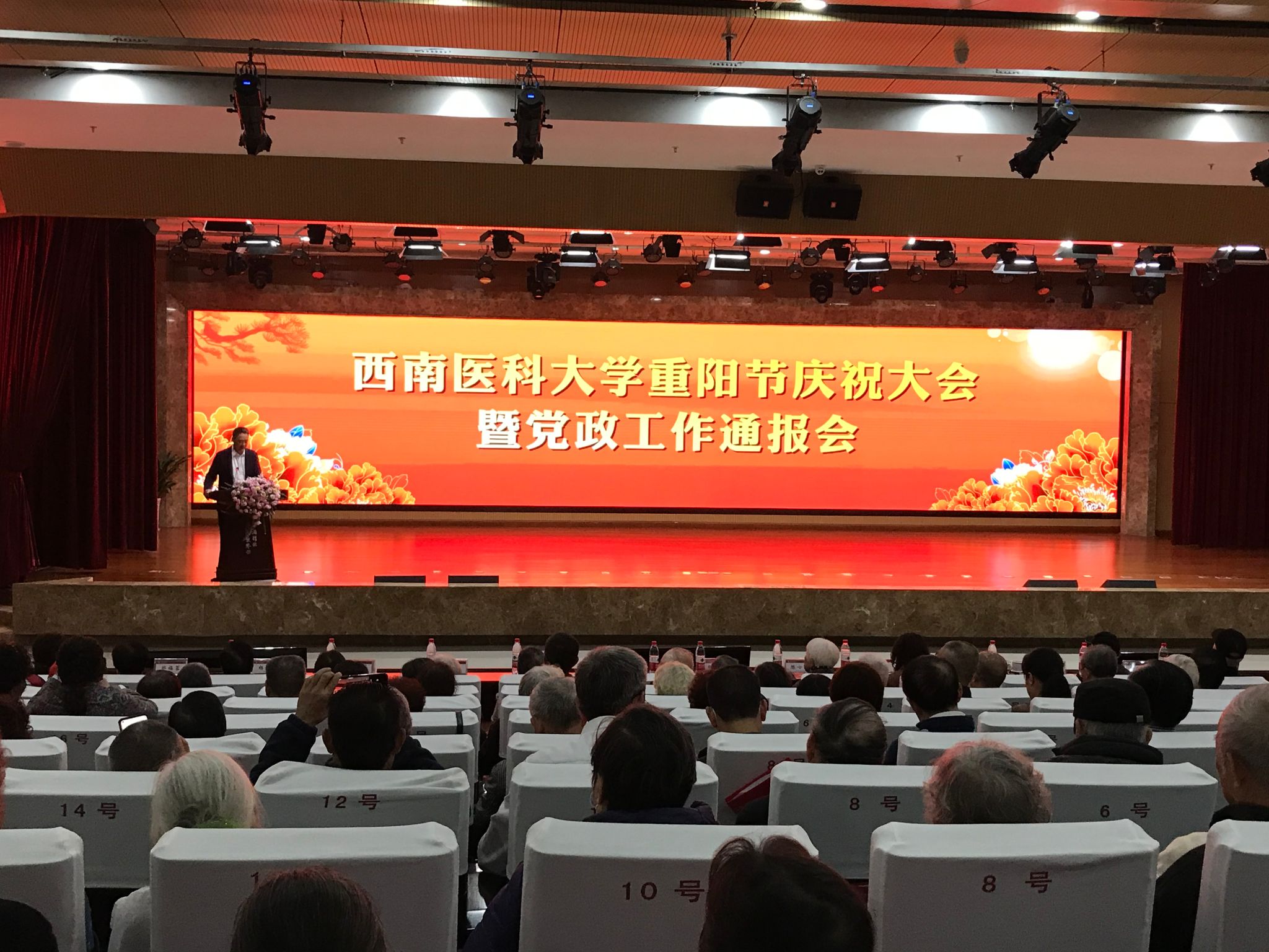 尊老、敬老、爱老、助老是中华民族传统美德。在重阳佳节来临之际,10月19日,学校在城北校区第一学术报告厅举行了2023年重阳节庆祝大会暨党政工作通报会。学校党委书记廖斌,党委常委、副校长何涛,相关职能部门主要负责人及250余名离退休老同志参加会议。大会由离退休党委书记、离退休工作处处长李建英主持。