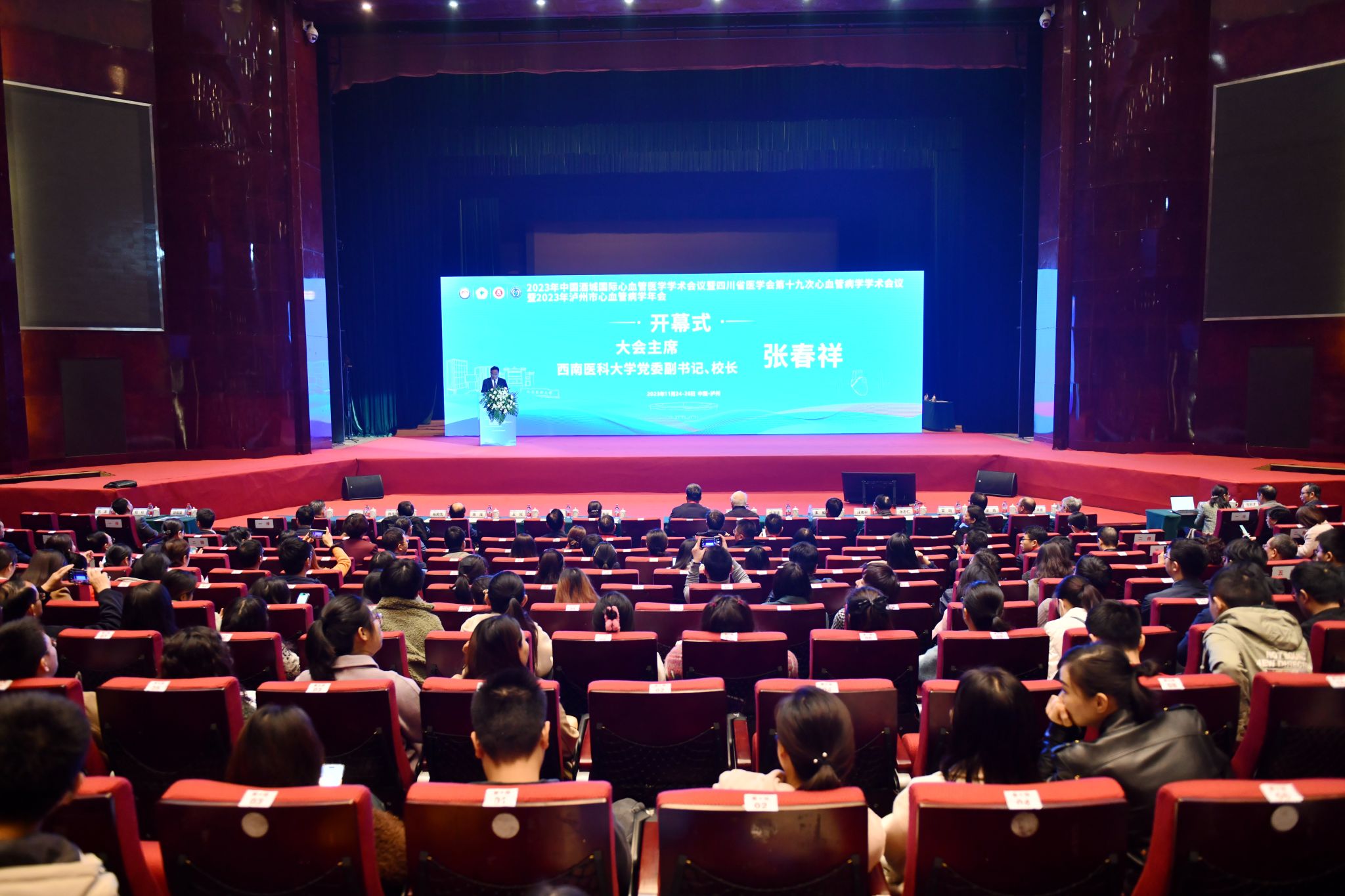 11月25日,2023年中国酒城国际心血管医学学术会议暨四川省医学会第十九次心血管病学学术年会在泸州市巨洋大剧院正式开幕。泸州市副市长罗素平,大会名誉主席北京大学唐朝枢教授,北京大学王宪教授,浙江大学徐清波教授,大会主席、四川省医学会心血管病分会主任委员陈茂教授,beat365官方网站党委书记廖斌等专家代表现场参加开幕式。