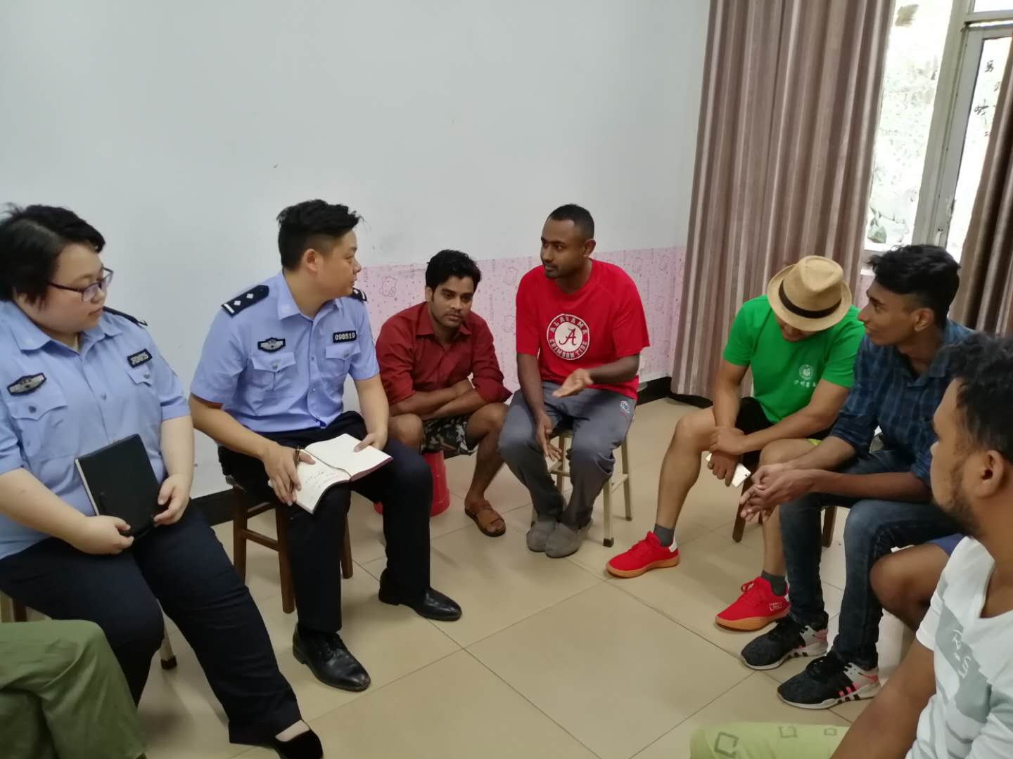 在留学生辅导员的陪同下,6名来自印度和孟加拉的留学生与民警进行了一场温馨的谈话。派出所冯捷警官详细询问了在校留学生的生活与学习情况,嘱咐留学生要保持与家人的沟通联系,平常外出时要注意个人防护,加强个人安全意识。