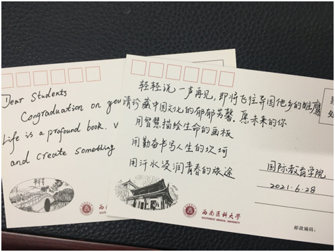 又是一年毕业季,国际教育学院今年有两名硕士留学研究生顺利毕业,1名硕士留学研究生参加了毕业典礼暨授位仪式,1名硕士留学研究生在海外隔着屏幕感受毕业典礼的氛围。国际教育学院今年为留学研究生筹备的毕业生礼物之一——教师手写明信片赠送毕业生,为学生献上毕业祝福。
