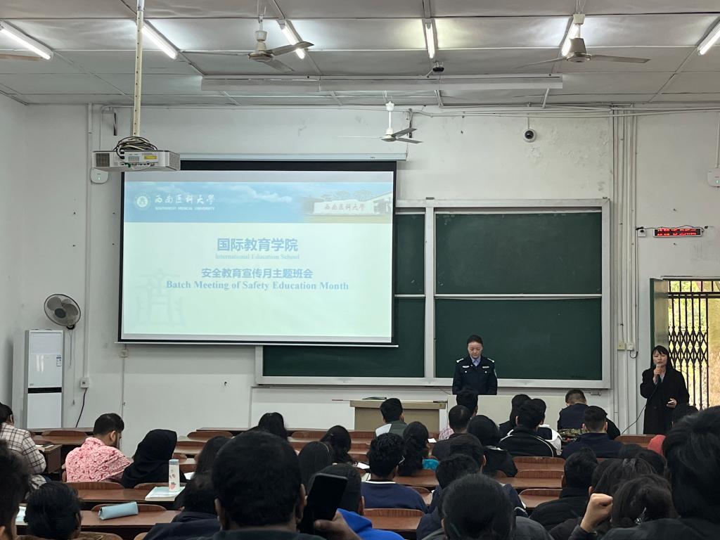 为切实增强留学生安全意识,法纪意识,维护校园安全稳定,国际教育学院于近日启动了“安全教育宣传月”活动。3月16日,国际教育学院邀请泸州市江阳区公安分局出入境大队、泸州市公安局交通警察支队一大队和北城派出所在忠山校区联合开展了安全教育宣传月之普法教育主题班会。本次主题班会主要包括出入境相关法律法规知识普及、交通安全相关知识讲解、以及治安管理处罚条例解析。