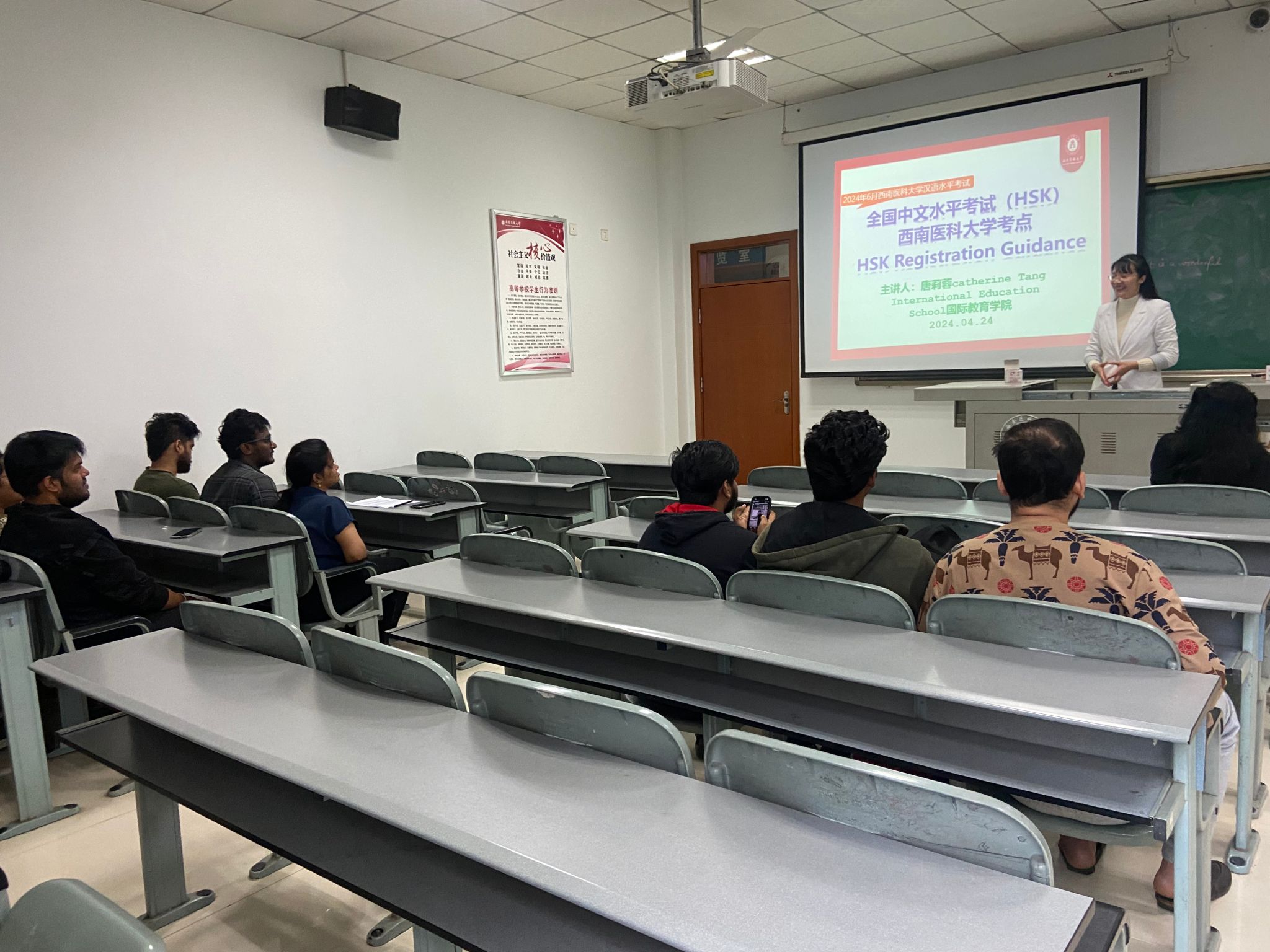 文化悠悠传千载,才思灼灼传未来。为进一步做好beat365官网全国中文水平考试(HSK)考点宣传工作,4月24日下午,国际教育学院在忠山校区粒香苑403教室组织开展了以语言为桥 赴中文之约——全国中文水平考试(HSK)beat365官方网站考点考试报名宣讲会,beat365官网来自忠山校区临床医学专业(英语授课)的留学生参加了此次宣讲会。