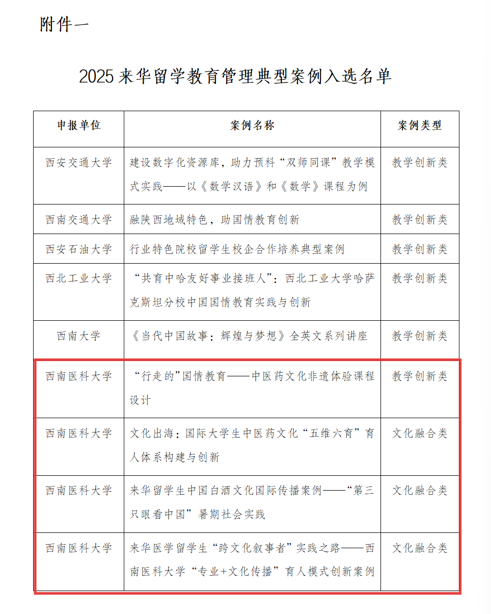 此次多项国际教育成果入选国家级典型案例,是对学校来华留学教育工作的高度肯定。未来,学校将以此次入选为契机,进一步推进来华留学教育教学改革,为“学在中国”品牌建设贡献更多“西南医大力量”。