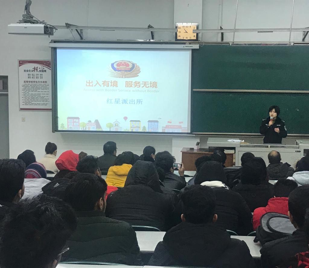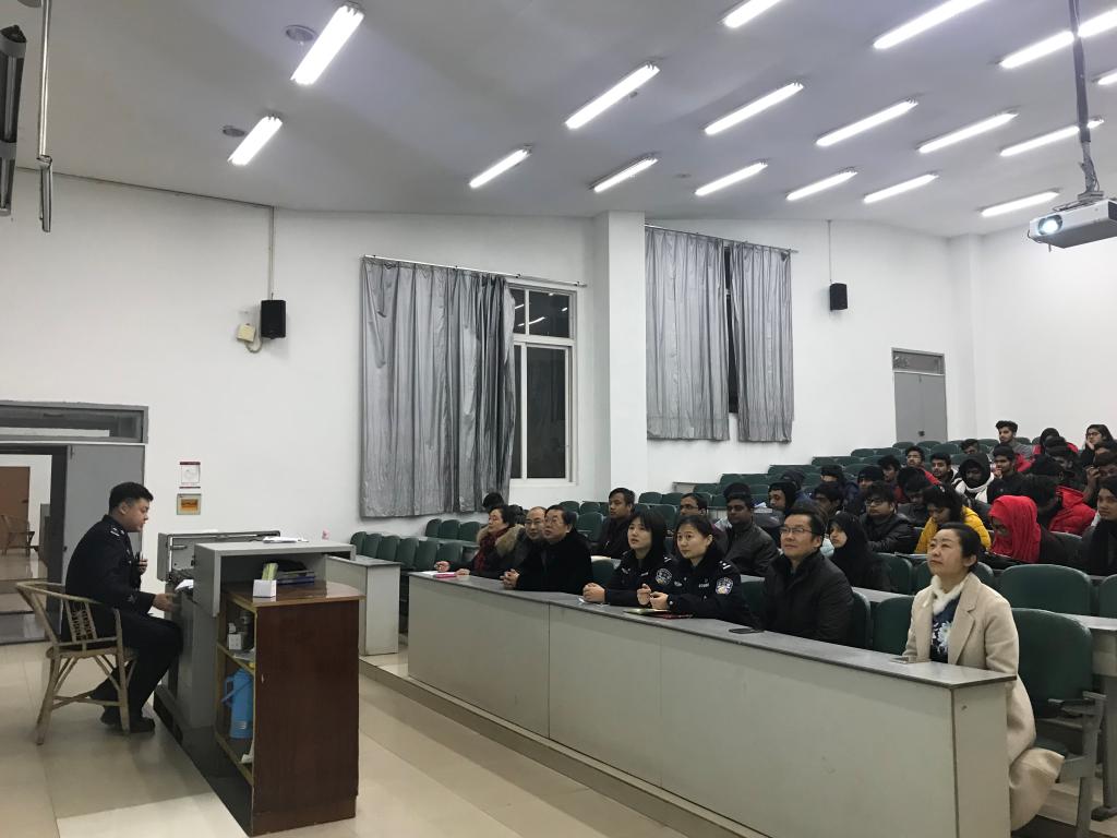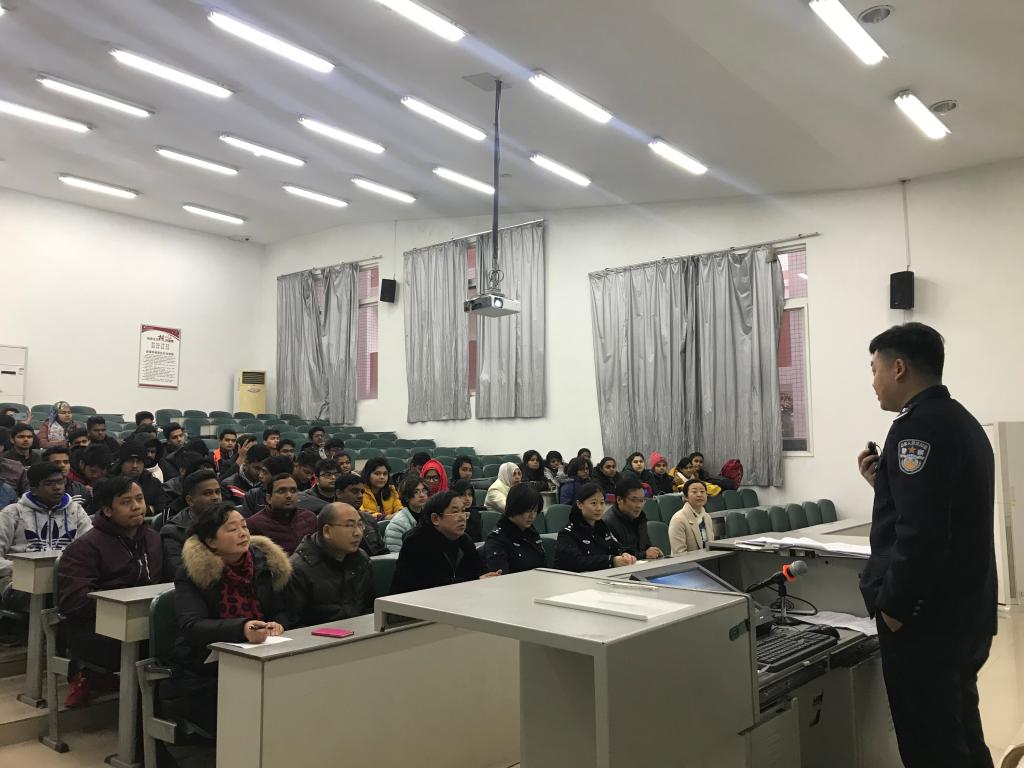 2019年1月11日学校保卫处与国际教育学院联合邀请了泸州市龙马潭区公安分局出入境大队和红星派出所涉外民警,对国际教育学院2018级留学生新生开展了主题为 “警校共育﹒护航留学路”的安全知识讲座。学校保卫处杜杰副处长、国际教育学院党总支书记李昌平、院长田耘、党总支副书记肖洁、泸州市龙马潭区公安分局出入境大队和红星派出所相关领导出席本次讲座,涉外民警冯警官和姜警官为学生做了详细的讲解。