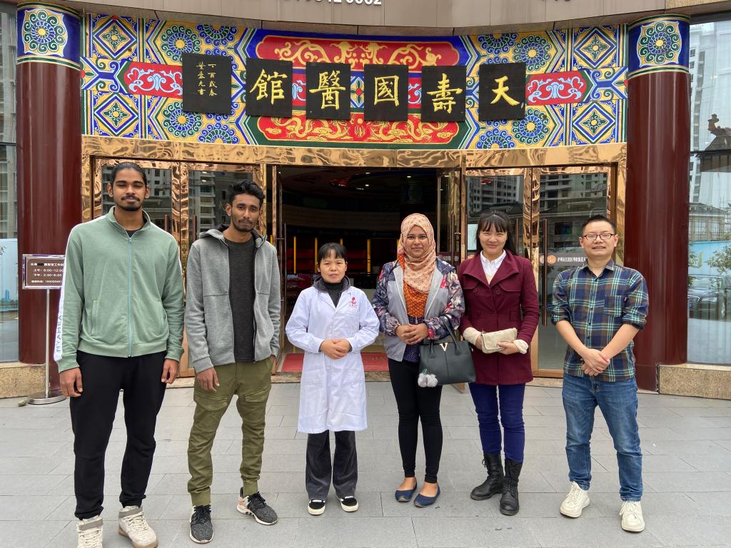 10月22日是第30个“世界传统医药日”,国际教育学院中国文化教研室组织beat365官网国际大学生开展中医药文化的认知型实践和体验性实践课程。通过参观beat365官方网站附属中医医院天寿国医馆,开展中医文化知识学习、中医药文化景观欣赏、中医药文化学习体验三个层面的深入实践。在实地参观过程中,国际学生们近距离观察中草药植物、中医药材,认识传统中医工具,体验针灸、推拿等传统中医理疗项目,并与在场中医医生互动交流,切身感受中医魅力,进一步提升对中医的认知,让国际大学生充分领略中医药文化的独特魅力和深刻内涵。