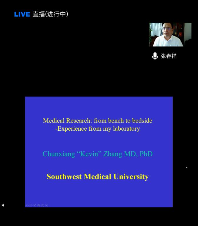 本次线上讲座以“医学研究:从实验室到临床”(Medical Research:from bench to beside)为主题,张春祥从基因、分子、细胞、动物模型到临床病人为轴线,结合其研究室20多年的心血管疾病研究代表性课题及现代医学研究前沿,深入浅出地讲授了如何从事医学研究。他鼓励医学专业国际学生,在打好本科临床医学专业学习的理论和临床技能基础之上,有意识地根据个人兴趣进行医学研究探索。期望学生将来既要成为具有精湛诊疗技术的“名医”,又要成为不断创新的“医学科学家”。