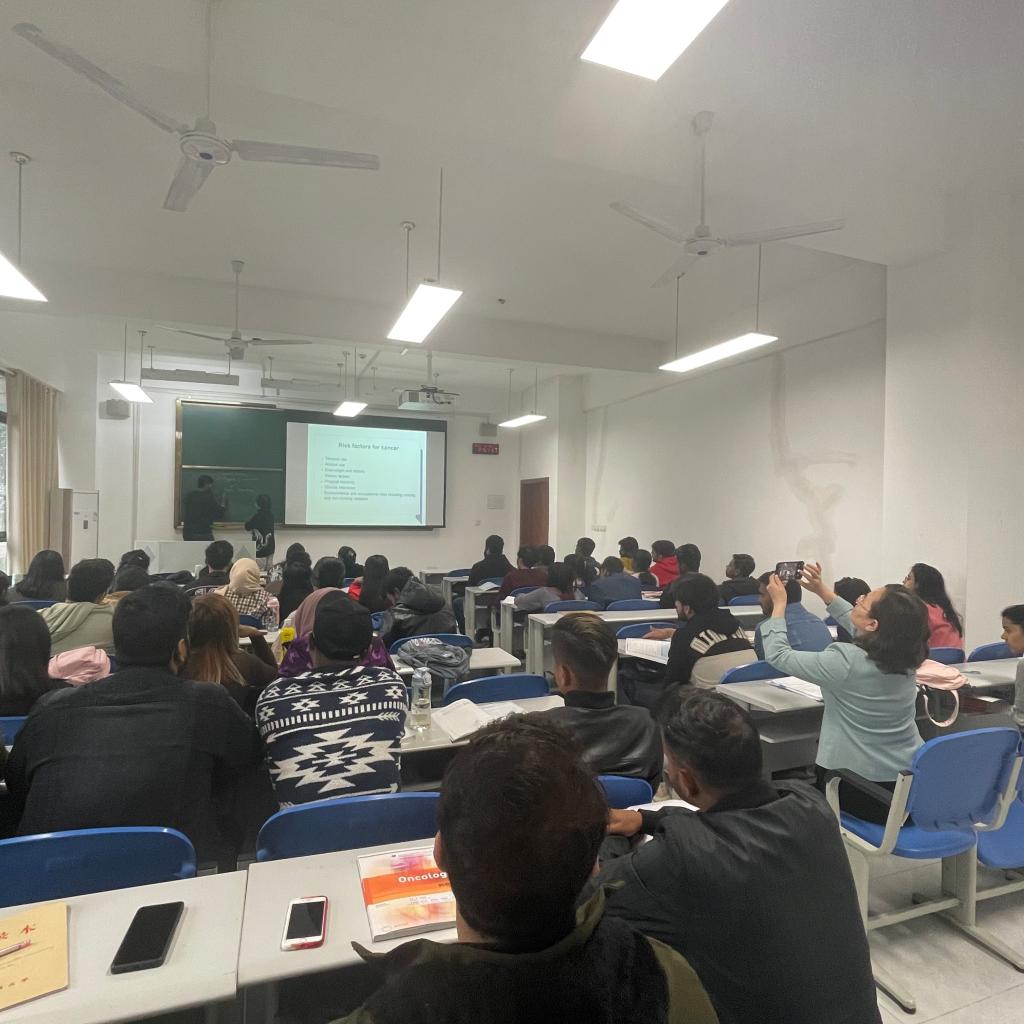 上午通过对2018级留学生《急诊医学》、2019级留学生《肿瘤学》课程的听课;下午通过对2018级外科学(2)、2019级内科学(1)见习课程的实地走访;留学生任课教师的教学认真、授课严谨,熟悉讲授内容,英文表达流利,跨文化交际能力较强,注重启发式教学,课堂互动充分有效,课堂气氛好。医院实习带教老师以出色的医学实践技能、负责严谨的教学态度赢得留学生实习生的高度赞同与喜爱。