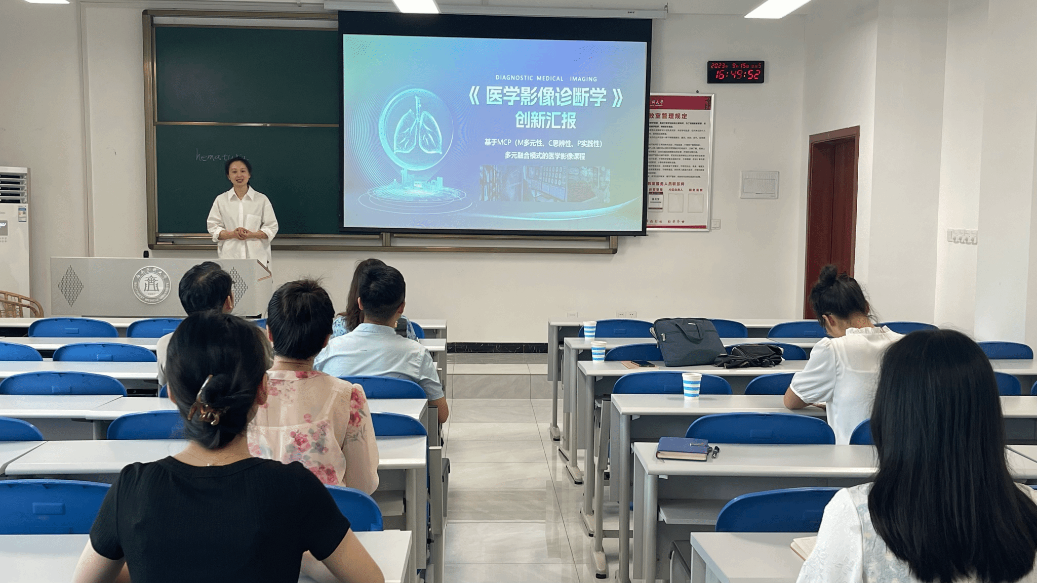 培训会上,辛页结合《医学影像诊断学》创新汇报—《基于MCP(M多元性、C思辨性、P实践性)多元融合模式的医学影像课程》展现了一个有深度有温度有挑战的参赛课程。同时辛页结合自身教学实际,分享了以往参赛经验,以自身参赛的课程为例强调在教学创新中,分析把握真实问题的同时,要突出课程思政的融合,展现学科特色,将教学创新、技术应用体现于课堂教学中。参培教师积极展开分享交流。