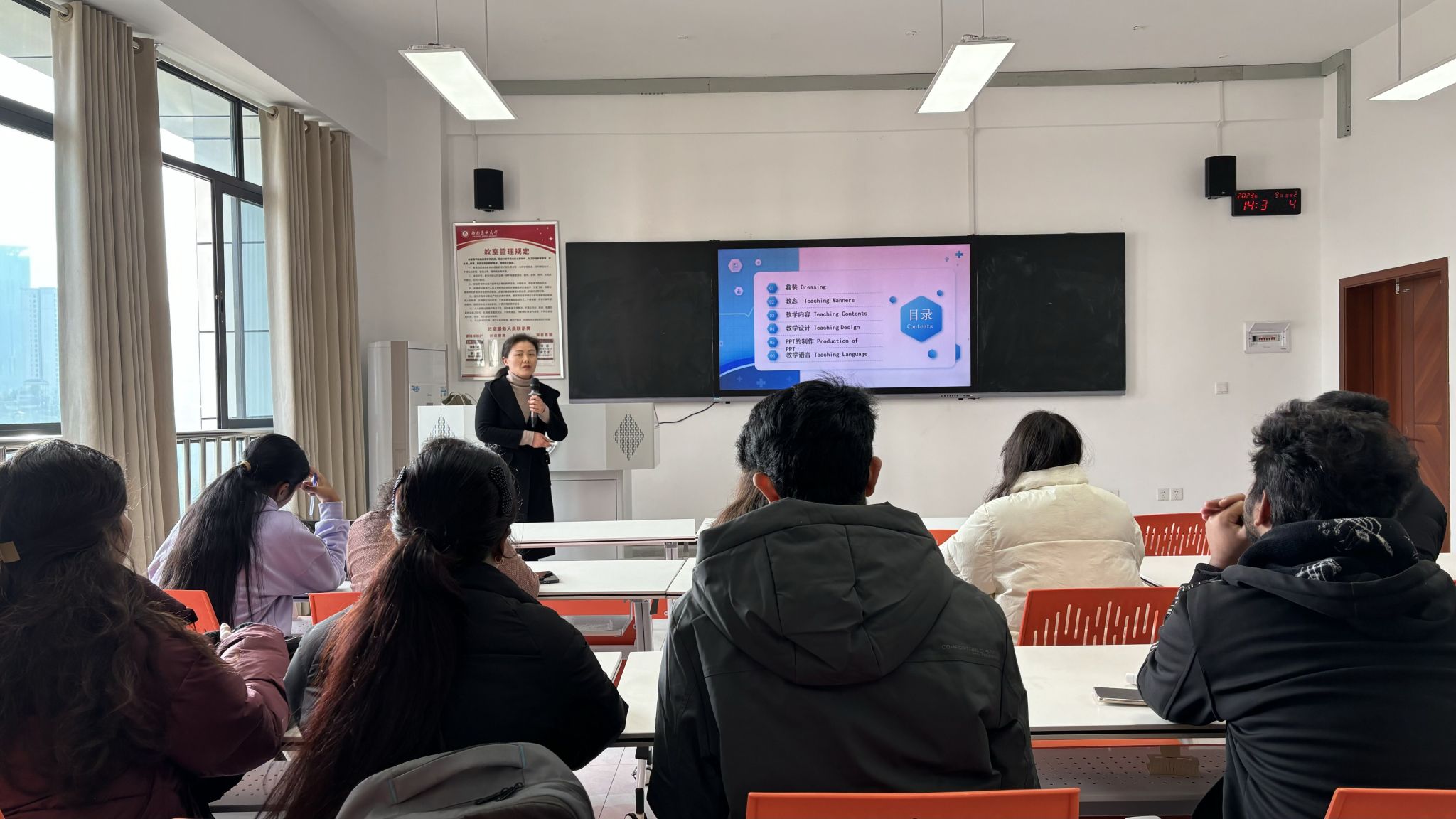 1219日,一场别开生面的beat365官方网站在地国际化:“生亦师”中外大学生全英讲课总决赛专家指导会在文渊楼404教室成功举行。本次专家指导会由基础医学院副院长曾永秋副教授讲授,国际教育学院学生科全体老师以及所有决赛选手参加了此次指导会。曾永秋以“讲台上的学问”为题,从着装、教态、教学内容、教学设计、PPT制作以及教学语言等六方面对决赛中外选手进行了深入的培训。