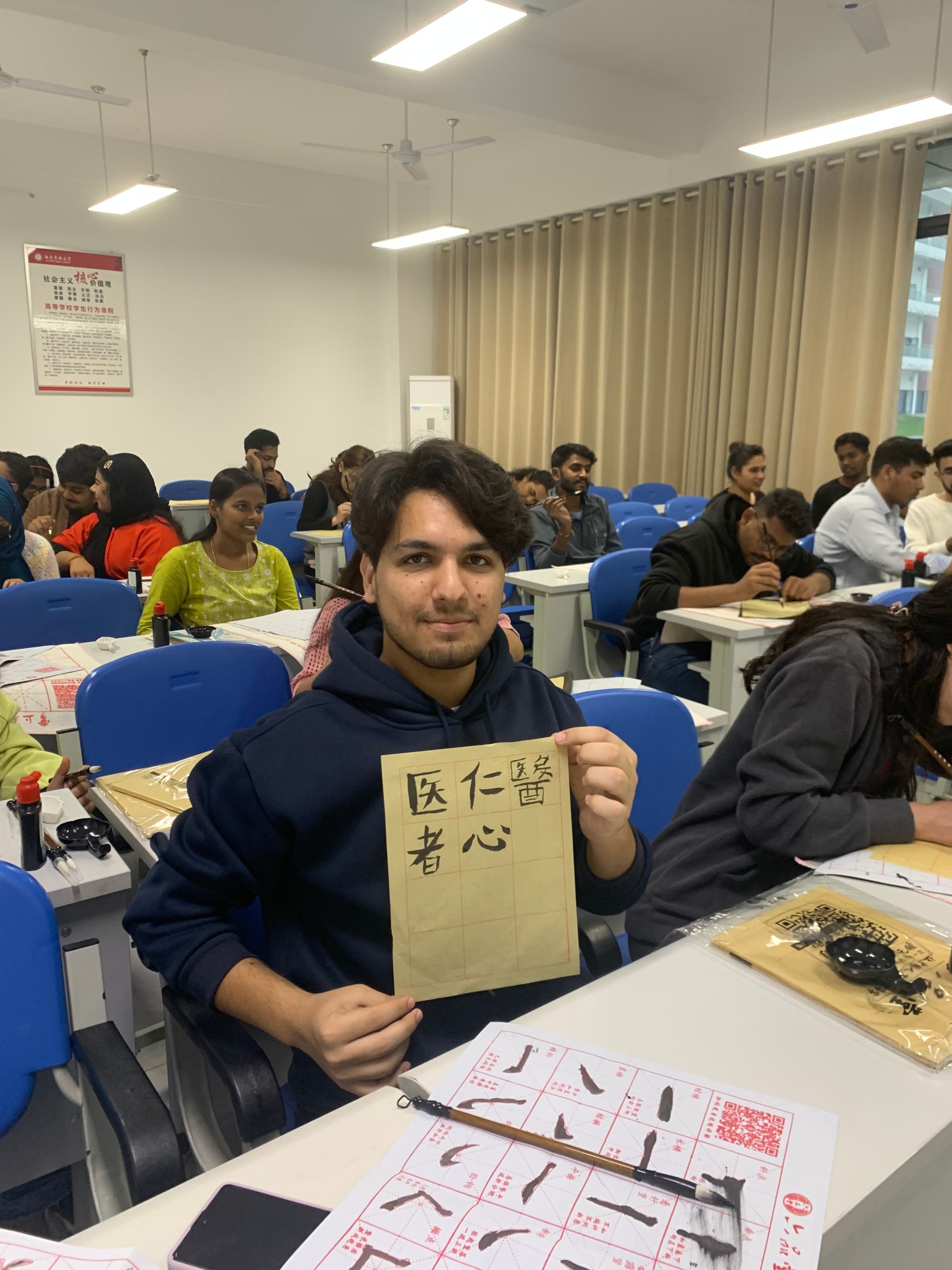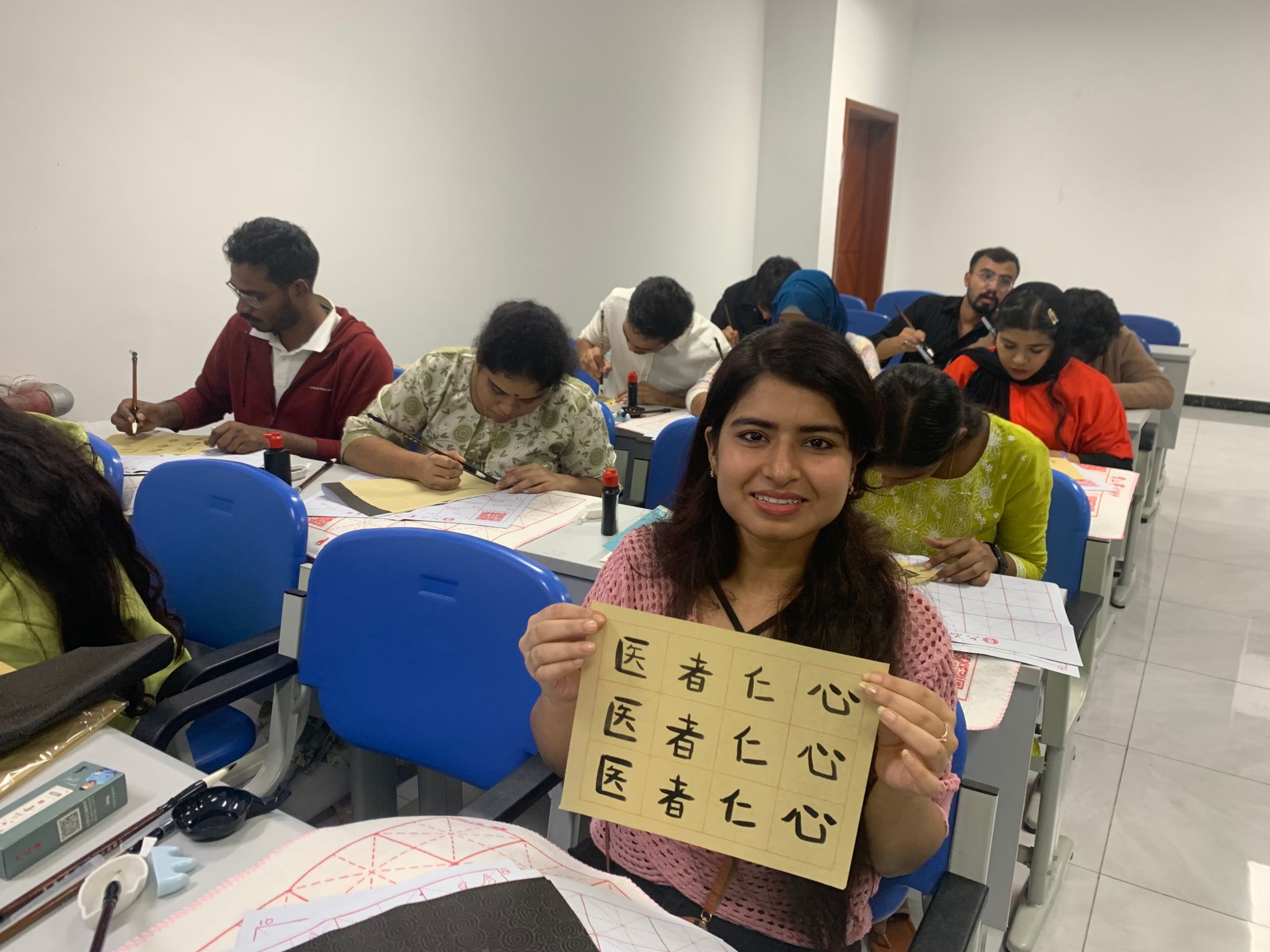 在国际教育学院教师陈勤、唐莉蓉、牛艳梅的带领下,留学生们认知中国书法构成的要素和书写工具,了解不同的书法字体。留学生通过老师现场指导“医者仁心”的书写及在中国学习的亲身经历中体悟“医者仁心”的传统哲学思想和价值观念。通过这次书法体验活动,帮助留学生更好地认识医生的责任感和使命感,增强其对中华文化的理解与认同,促进留学生成为中外文化交流使者。