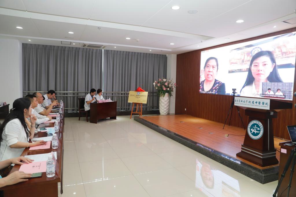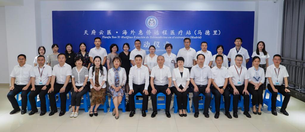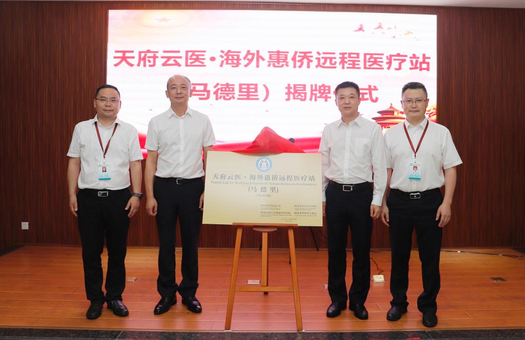 启动仪式上,四川省侨办主任文甦,四川省中医药管理局局长田兴军,beat365官方网站附属中医医院党委书记李志、院长刘建共同为“天府云医•海外惠侨远程医疗站(马德里)”揭牌。