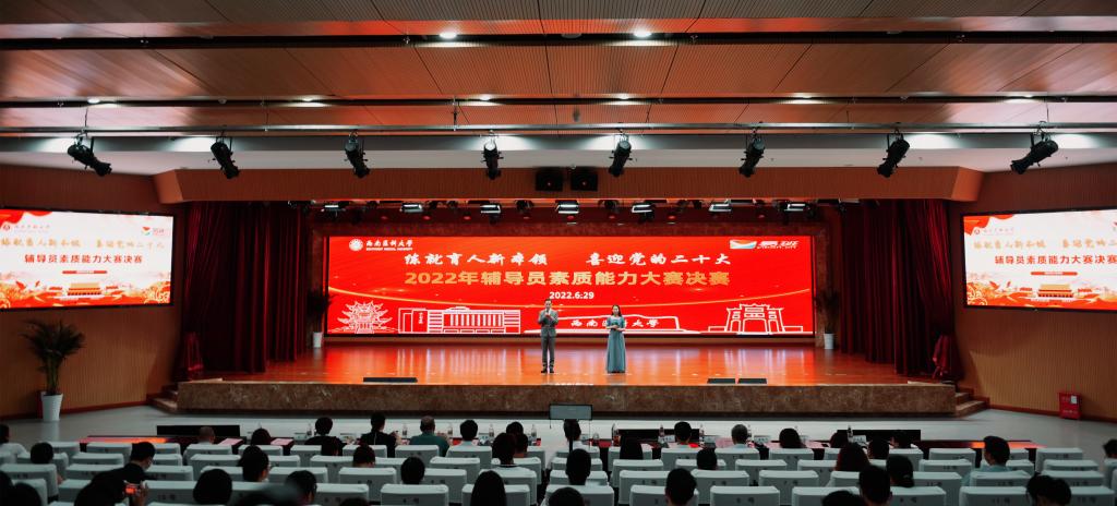 6月29日下午,学校在城北校区第一学术报告厅举办2022年“练就育人新本领 喜迎党的二十大”辅导员素质能力大赛决赛。学校党委书记廖斌,党委副书记刘毅,党委常委、副校长彭钢、何涛、聂敏海、代荣阳应邀出席,党委常委、组织部部长冯天明,党委常委、宣传部部长柏珂,学生工作部部长谭群英,团委书记石惠,教务处处长郑小莉,教育评价与教师发展中心主任赵琼,马克思主义学院院长黄晓利,党政办公室副主任叶玉霞,人事处副处长李理担任本次大赛评委。全校学生政工干部共计100余人现场观摩学习。大赛由外国语学院学生科科长刘烨和口腔医学院辅导员雷杰主持。