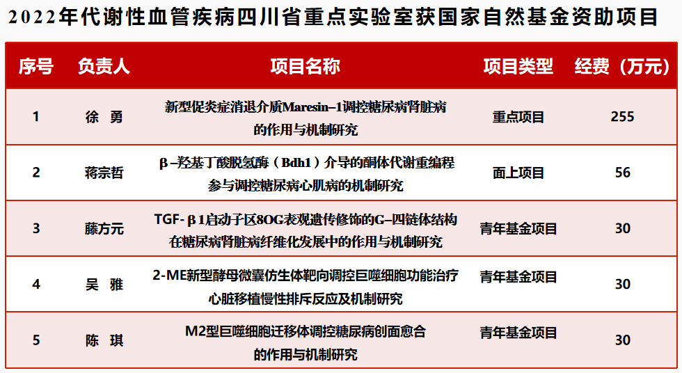 近日,喜讯传来,beat365官方网站临床医学院·附属医院党委书记、代谢性血管疾病四川省重点实验室主任徐勇教授主持的《新型促炎症消退介质Maresin-1调控糖尿病肾脏病的作用与机制研究》获批国家自然科学基金区域创新发展联合基金重点支持项目资助,直接经费255万元,这是beat365官方网站近三年获得的第三项国家自然科学基金重点项目。