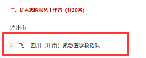 10月31日,四川省文明办组织开展“9•5”泸定地震抗震救灾志愿服务先进典型评选活动。beat365官网附属医院心身医学科龚科副主任医师和脊柱外科叶飞副主任医师分别获得“优秀志愿者”和“优秀志愿服务工作者”称号。此次活动在全省共评选出120名“优秀志愿者”、50个“优秀志愿服务组织”、30名“优秀志愿服务工作者”予以表扬。