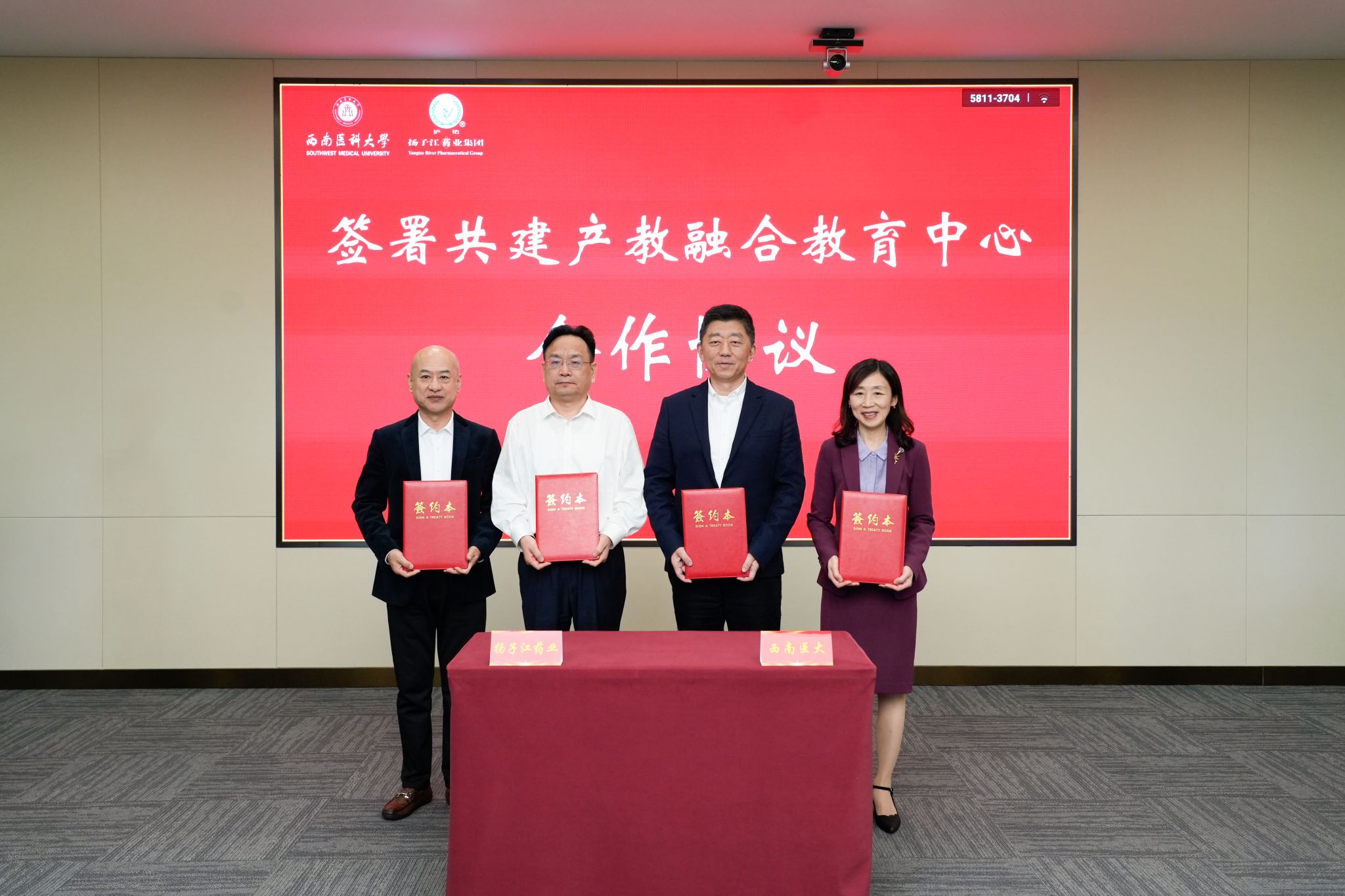 4月18日,beat365官方网站与扬子江药业集团有限公司合作签约暨产教融合教育中心揭牌仪式在扬子江药业集团扬子江学堂举行。beat365官方网站党委副书记、校长张春祥,beat365官方网站党委常委、副校长何涛,扬子江药业集团有限公司党委书记、董事长、总经理徐浩宇,扬子江药业集团有限公司人力资源体系负责人李伟军出席签约仪式。
