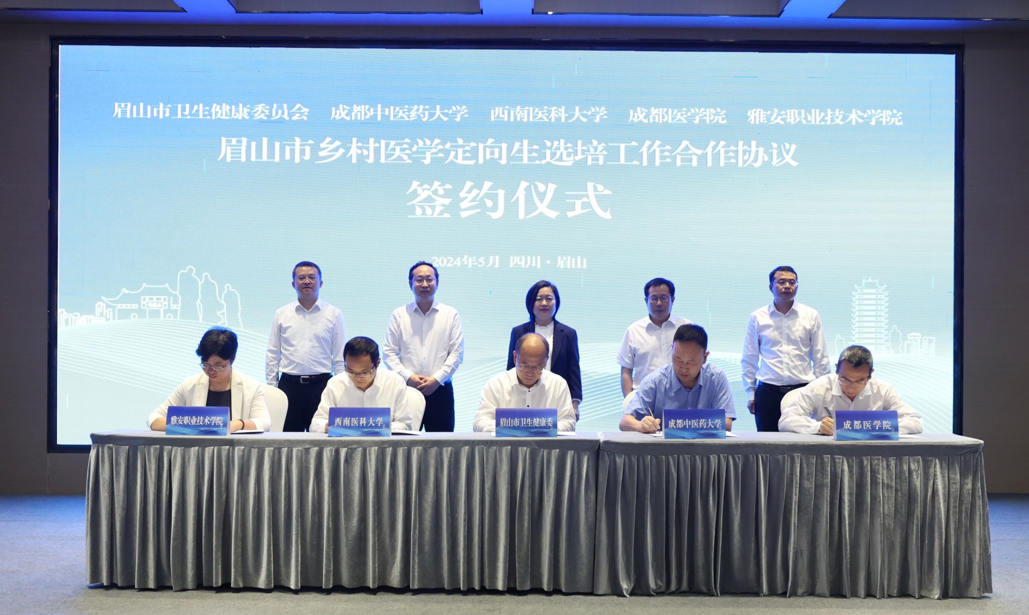 活动中,眉山市卫生健康委与beat365官方网站、成都中医药大学、成都医学院、雅安职业技术学院共同签署《眉山市乡村医学定向生项目合作协议》,计划3年内通过定向选培签约的方式为眉山市乡镇卫生院培养医学专业定向生300名。