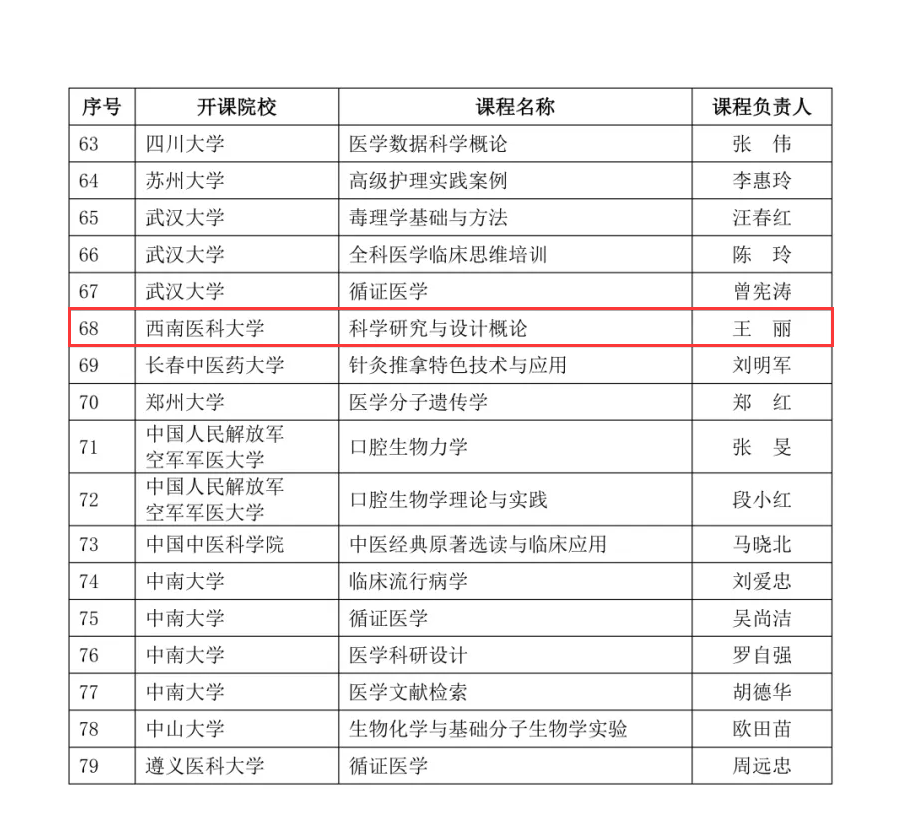日前,全国医学专业学位研究生教育指导委员会公布了首批全国医学专业学位研究生在线示范课程拟认定名单,beat365官网中西医结合学院王丽教授的《科学研究与设计概论》课程获批认定,beat365官网是川内除四川大学外唯一获认定的医科类院校。