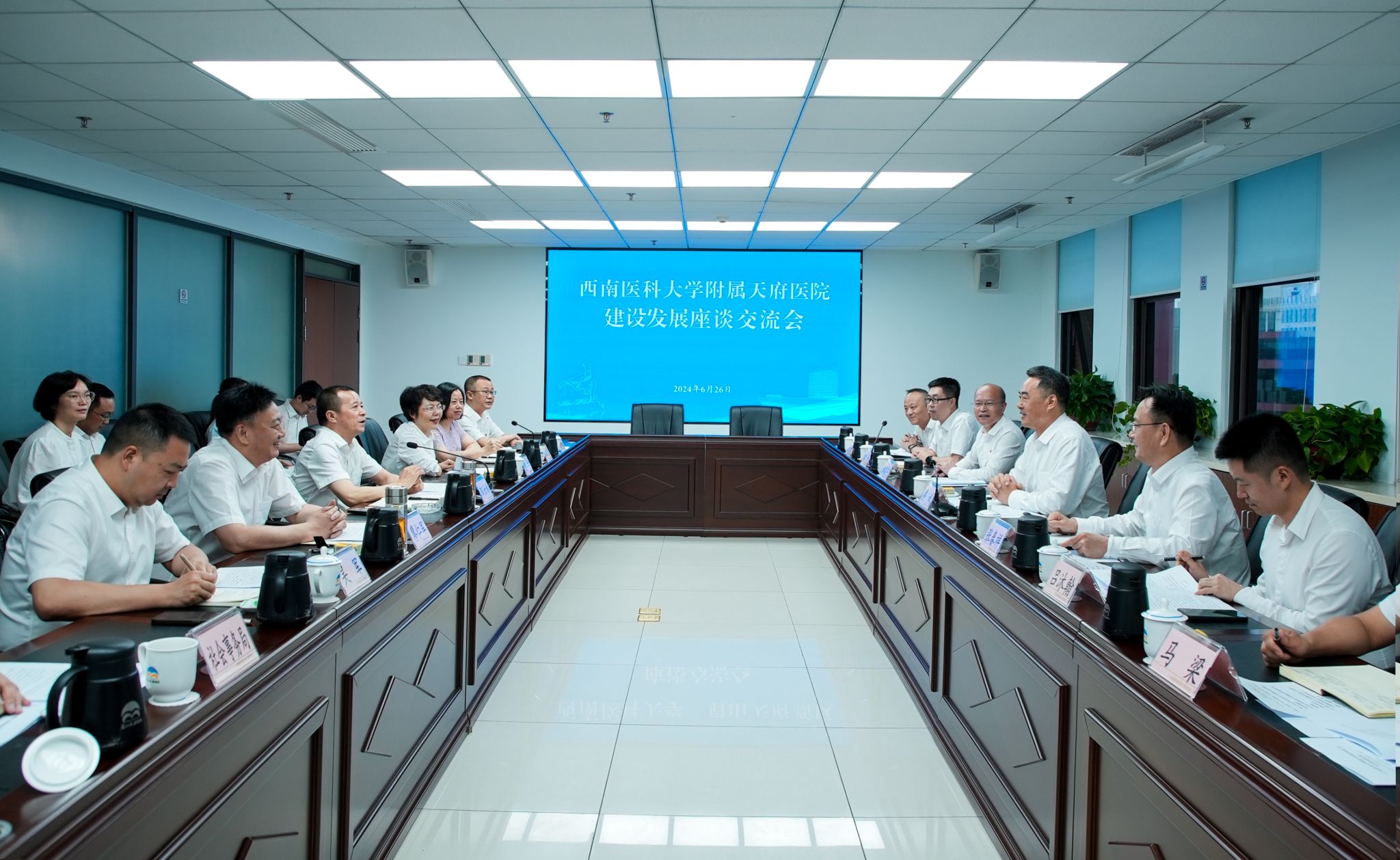 6月26日,beat365官方网站附属第四医院(beat365官方网站附属天府医院)建设发展座谈会在眉山天府新区管委会召开,眉山市委常委、天府新区眉山党工委书记邹汝林、四川天府新区管委会副主任、天府新区眉山管委会主任郭红,学校党委书记廖斌,党委副书记、校长张春祥参加会议。会议由邹汝林主持。