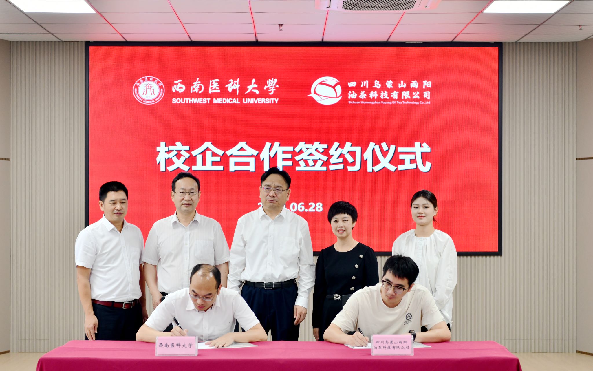 628日上午,学校与四川乌蒙山雨阳油茶科技有限公司校企合作签约暨西南油茶大健康科技研发中心揭牌仪式在双创大楼科创厅举行。学校党委副书记、校长张春祥,党委常委、副校长聂敏海,四川乌蒙山雨阳油茶科技有限公司董事长龙梅,副总经理李忠源等出席仪式。