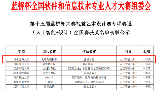 近日,在由工业和信息化部人才交流中心主办,蓝桥杯大赛组委会承办的“第十五届蓝桥杯大赛”设计赛专项赛道(人工智能+设计)中,医学信息与工程学院2021级信息管理与信息系统2班学生何聿同学的作品《蓝桥梦想》在大赛中斩获全国赛一等奖。