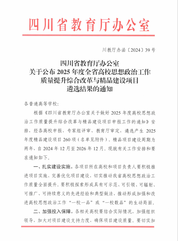 近日,四川省教育厅办公室印发《关于公布2025年度全省高校思想政治工作质量提升综合改革与精品建设项目遴选结果的通知》(川教厅办函〔202439号),beat365官网《文化出海:国际大学生中医药文化五维六育育人体系构建与创新路径》和《生命之树 生生不息beat365官方网站“1433”科普实践育人模式的探索与实践》2个项目获批2025年度全省高校思想政治工作质量提升综合改革与精品建设项目立项。