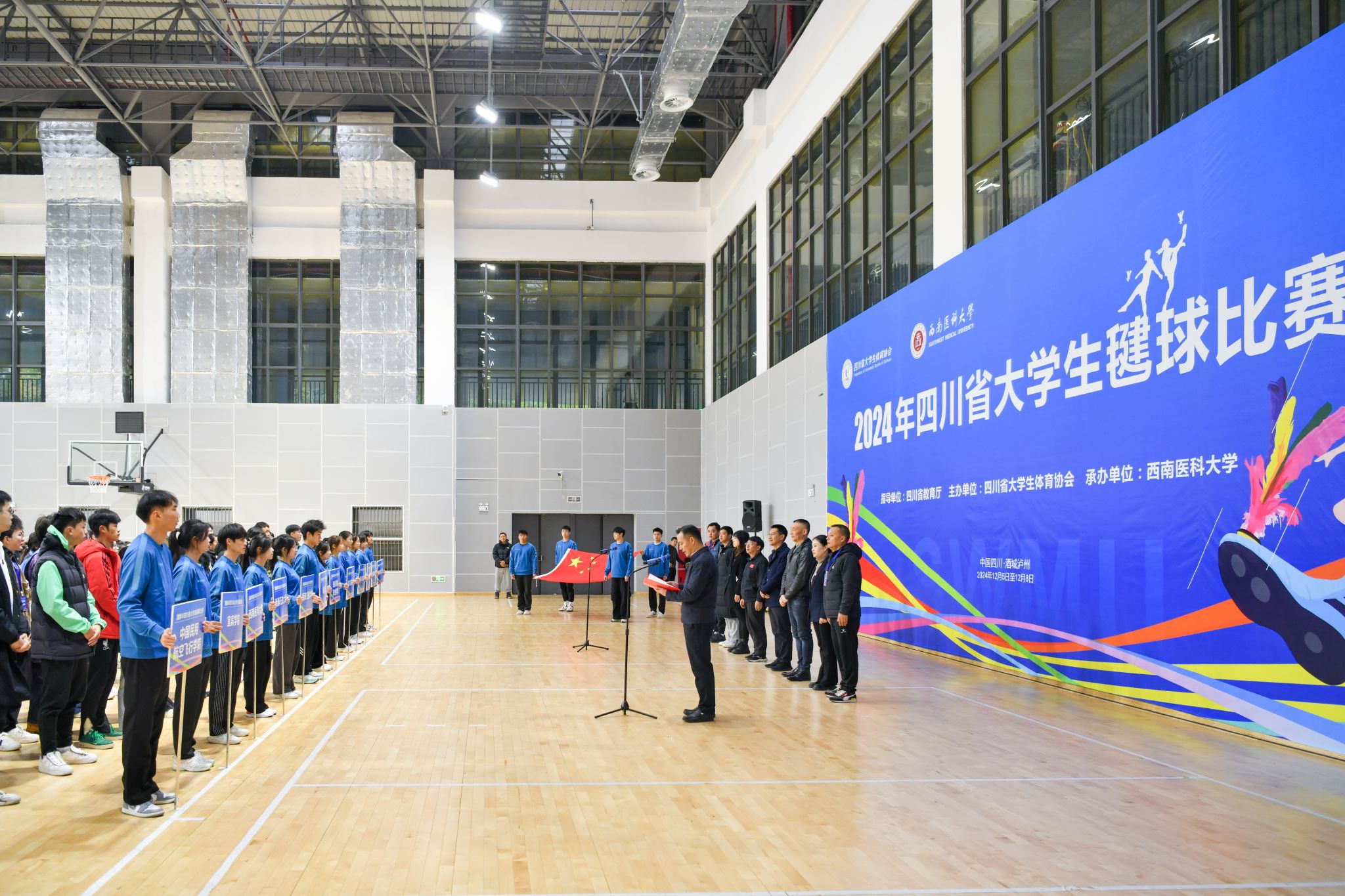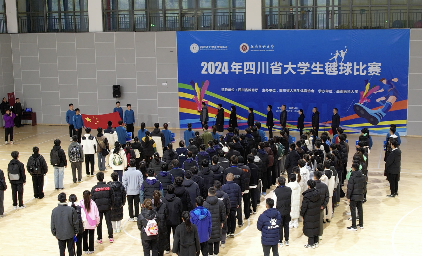 12月6日上午,2024年四川省大学生毽球比赛在青年体育馆开幕。学校党委常委、副校长、体委主任江涌,四川省大学生体育协会会长杨远波、竞训部部长吕志刚,学校体育学院党委书记邹小萍,赛事监督罗亚娟,裁判长廖健,副裁判长彭崴、刘中河等出席开赛仪式。仪式由学校体育学院院长王定宣主持。