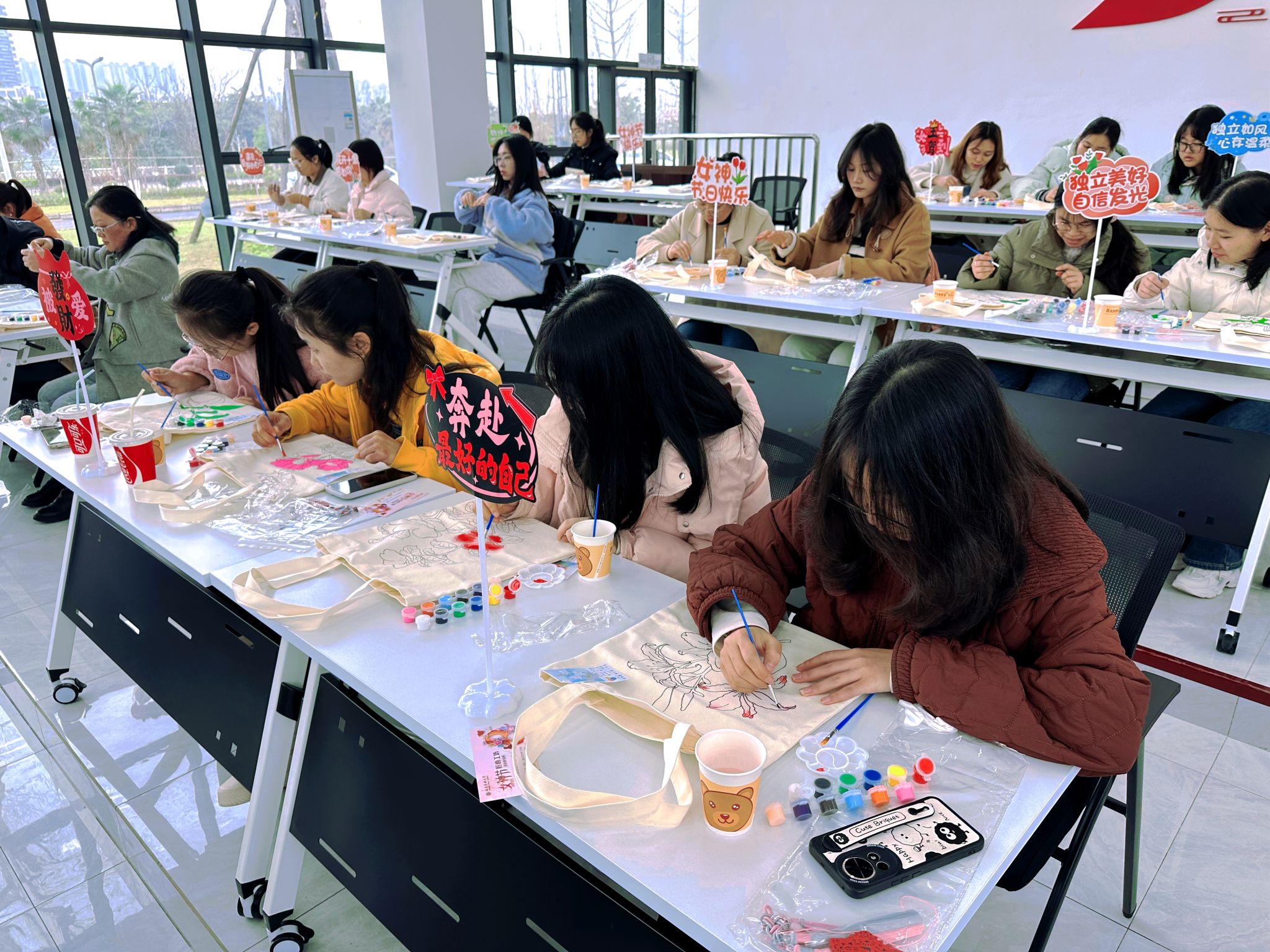 与此同时,“匠心工坊”——在新落成的妇联阵地,一场别开生面的传统手工艺品制作体验活动正在热烈进行。教职工手工协会的工艺大师们现场传授技艺,指导大家亲手制作布艺绘画、编织挂件等精美手工艺品。女性师生们积极参与,不仅体验到了传统文化的独特魅力,更在动手实践中感受到了创造的乐趣与成就感,每一位参与者都收获满满。
