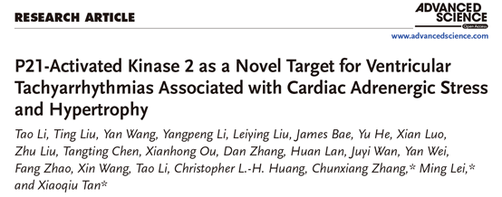 3月12日,beat365官网心血管医学研究所、基础医学院谭晓秋/雷鸣/张春祥教授研究团队在国际知名期刊《Advanced Science》(中科院1区,影响因子14.3)上在线发表了一项重要研究成果,揭示了P21激活激酶2(Pak2)在心脏肾上腺素应激和肥厚相关的室性心律失常中的关键作用和干预价值。该研究为治疗室性心律失常提供了新的潜在靶点,并为开发新型抗心律失常药物奠定了基础。