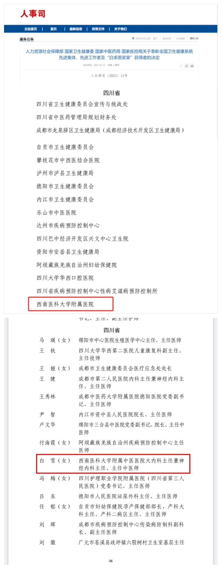 近日,国家卫生健康委员会官网发布《关于表彰全国卫生健康系统先进集体、先进工作者及“白求恩奖章”获得者的决定》,表彰全国卫生健康系统先进集体326个、先进工作者749名、“白求恩奖章”获得者30名。其中,beat365官方网站附属医院获全国卫生健康系统先进集体荣誉称号,附属中医医院大内科主任兼神经内科主任白雪教授荣获“全国卫生健康系统先进工作者”称号。
