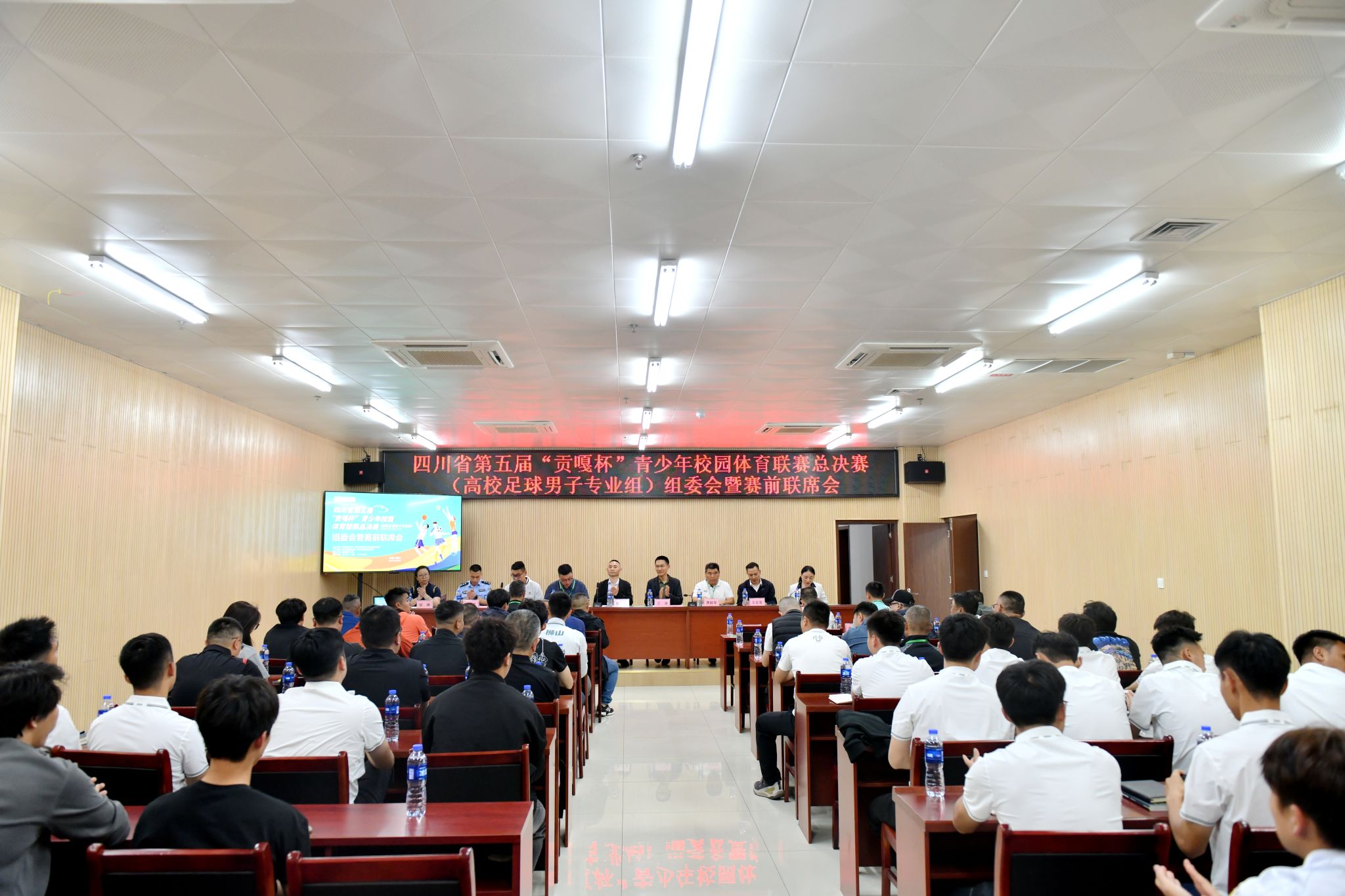 4月14日晚,四川省第五届“贡嘎杯”青少年校园体育联赛(高校足球男子专业组)总决赛组委会暨赛前联席会议在城北校区青年体育馆会议室举行。四川省教育厅体卫艺处副处长戴峰,学校党委常委、副校长、体委主任江涌,本届“贡嘎杯”比赛总协调、纪律监督刘晨,四川省校园足球协会常务副会长贾毅军,四川省足球协会裁判部副部长冯启航,体育学院院长王定宣,泸州市公安局龙马潭区分局红星派出所警官赵卿辉,卡尔美品牌赞助商代表邹琳,赛区比赛监督、裁判长、竞赛专员、裁判员,各参赛单位领队、教练员、球队队长等参加会议。会议由体育学院党委书记邹小萍主持。