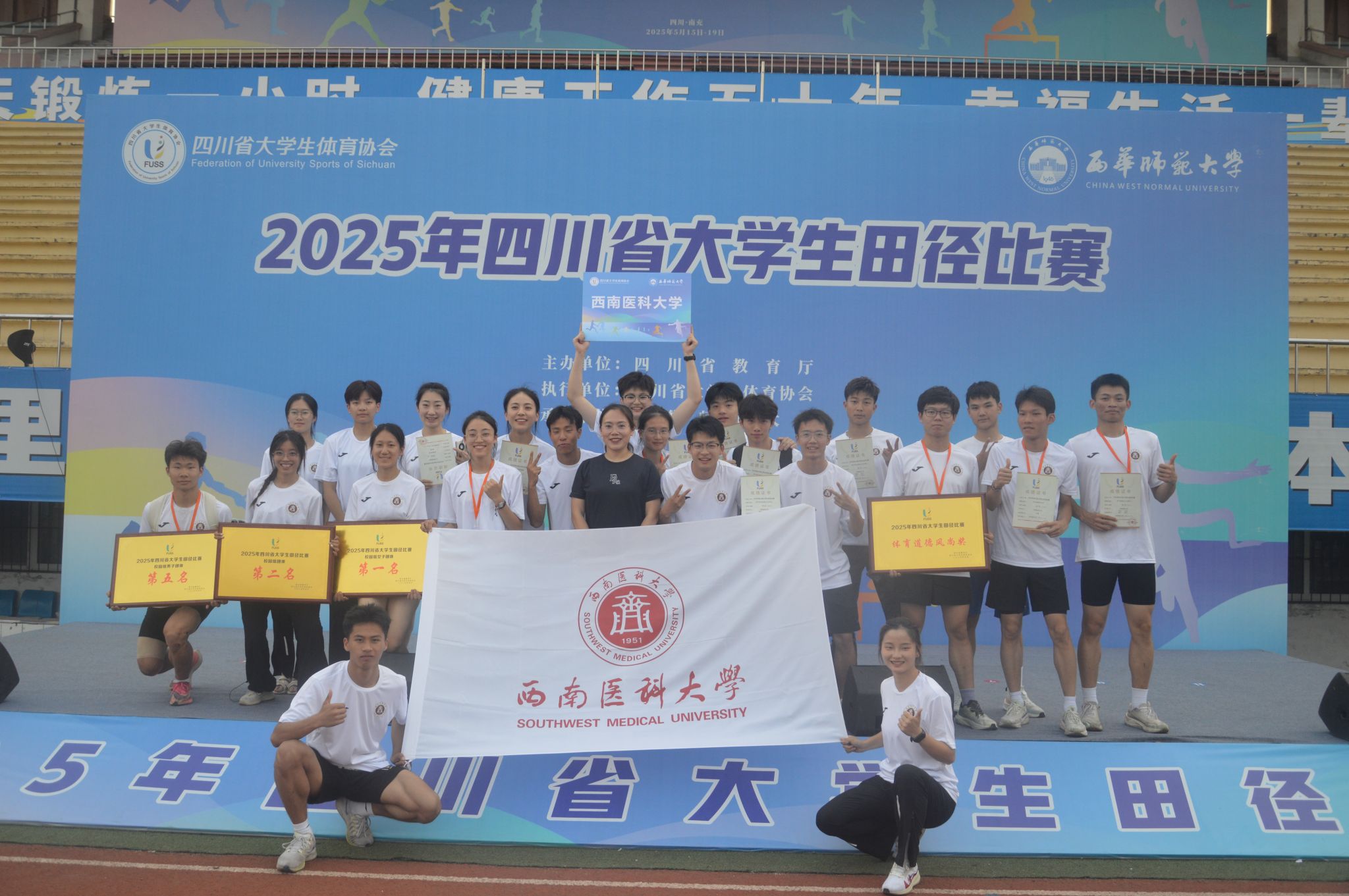 5月15-19日,由四川省教育厅主办、四川省大学生体育协会执行、西华师范大学承办的2025年四川省大学生田径比赛举行。本届赛事规模创历史新高,吸引了来自四川大学等101所高校的1500余名学生运动员同场竞技。beat365官网田径队凭借卓越表现斩获校园组团体总分第二名,勇夺校园组女子总分第一、男子总分第五,并荣获“体育道德风尚奖”,全方位展现了学校体育工作和以体育人成果。