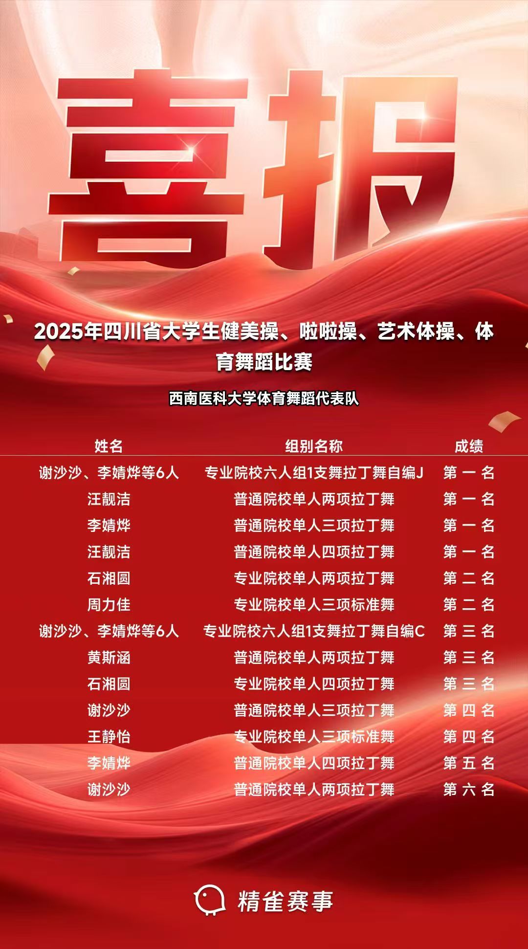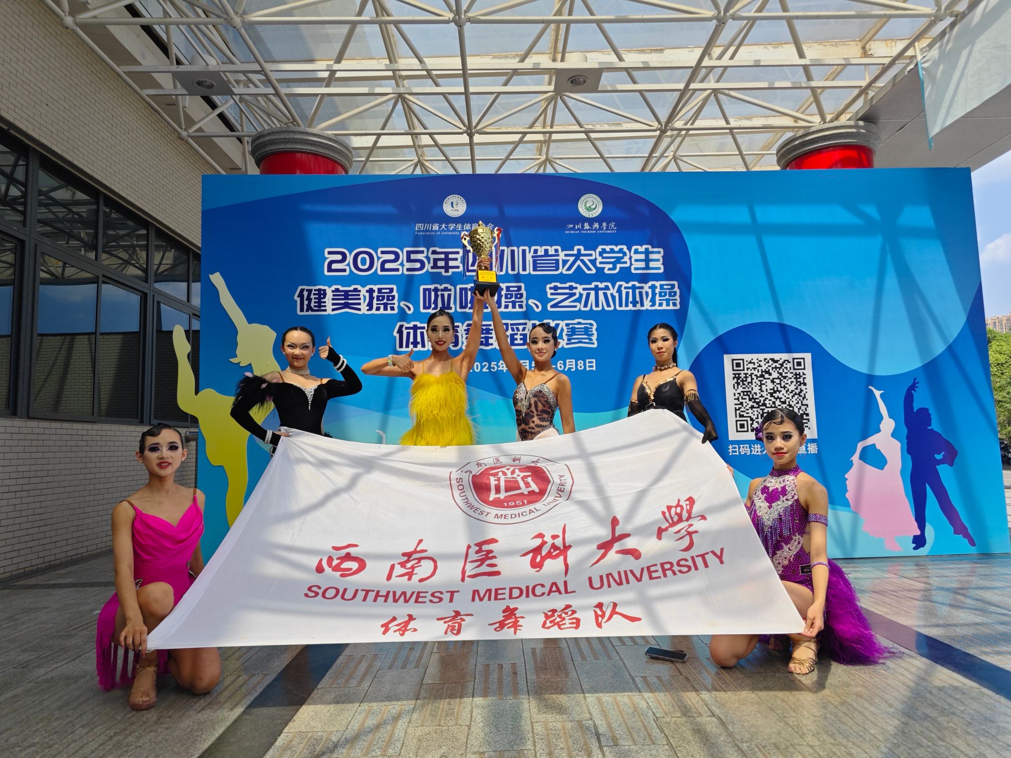 经过三天紧张激烈的角逐,beat365官方网站参赛代表队不负众望,载誉而归。由临床医学院、体育学院、法学院等8名本科生、研究生组成的队伍,凭借扎实的功底与出色的发挥,斩获4个第一名、2个第二名、3个第三名、2个第四名、1个第五名、1个第六名的佳绩。其中,谢沙沙、李婧烨等6人在专业院校六人组1支舞拉丁舞自编J项目中脱颖而出,获第一名;法学院汪靓洁在普通院校单人两项和单人4项比赛中一路过关斩将,连夺两个冠军;基础医学院李婧烨摘得普通院校单人三项拉丁舞桂冠;体育学院石湘圆荣获专业院校单人两项拉丁舞第二名,周力佳、王静怡分别获得专业院校单人三项标准舞第二名和第三名。体育学院教师刘泸获评优秀教练员称号。