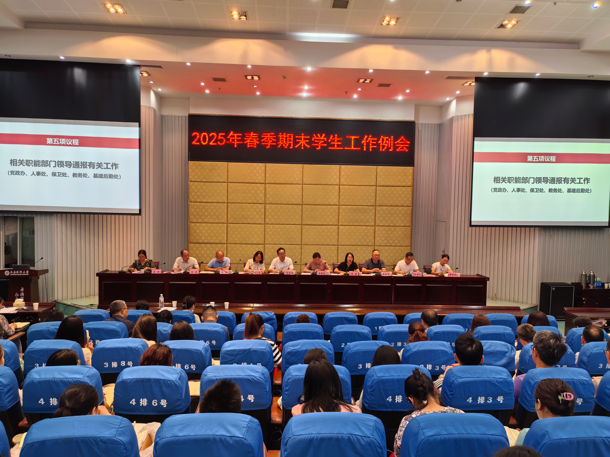会上,学生工作部副部长易娟、崔继东分别通报2025年上半年学生工作总结和暑假学生工作安排;团委综合科科长黄诗韵通报2025年上半年共青团工作总结并作共青团暑假工作安排;教务处处长郑小莉、党政办公室副主任陈敏、人事处副处长李理、保卫处副处长俞扬君、基建后勤处副处长陈勇分别通报了相关工作情况。