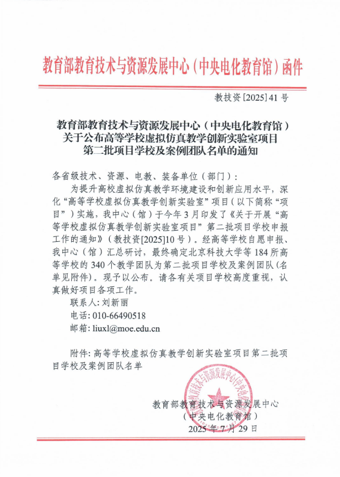 84日,教育部教育技术与资源发展中心(中央电教馆)下发《教育部高等教育司关于公布高等学校虚拟仿真教学创新实验室项目第二批项目学校及案例团队名单的通知》(教技资〔202541号),医学信息与工程学院娄岩教授团队申报的题为《“VR智绘医途”:医学虚拟仿真实验教学创新实验室构建与应用》与钟丽莎博士团队申报的题为《多学科交叉医学科普虚拟仿真创新实验室》获批立项。
