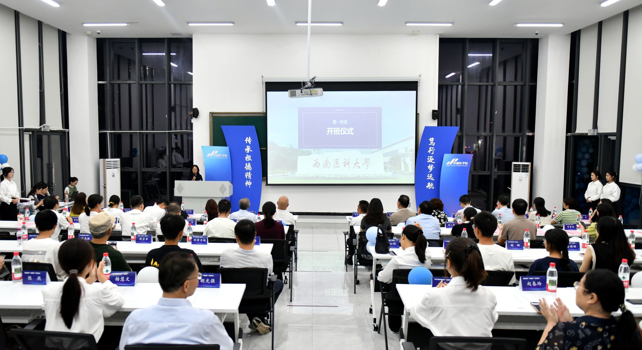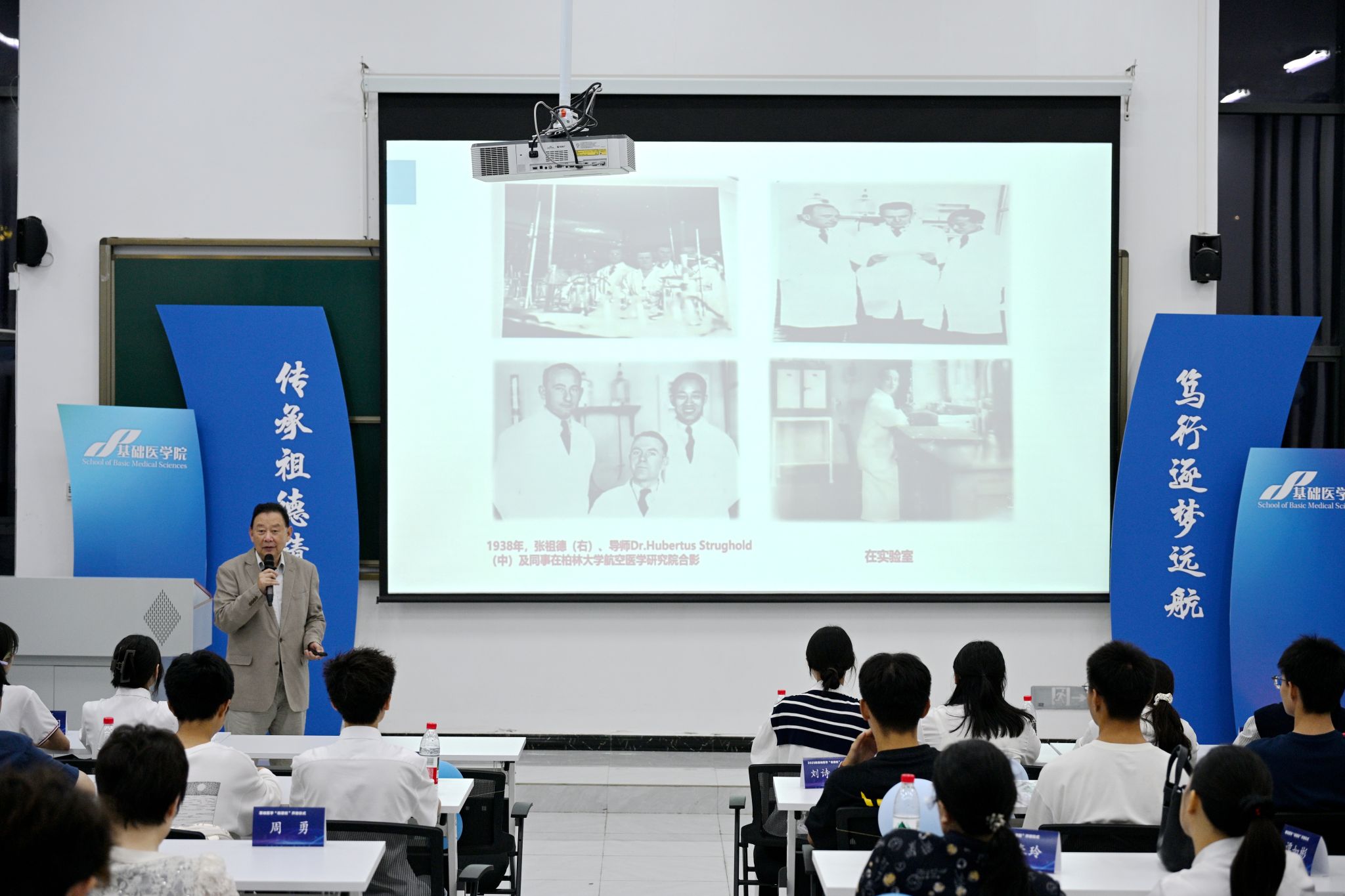 “祖德班”以学校建校元勋张祖德名字命名,是对其“胸怀家国、敢闯前沿、躬身实践、倾心育才”精神的深切缅怀与崇高致敬。仪式现场,基础医学院李林老师为大家讲述了张祖德先生的动人事迹,师生共同观看了以张祖德事迹为蓝本创作的微电影《抉择》。张祖德先生作为我国航空航天医学领域开拓者、留德医学博士,在抗战时期毅然回国投身医学教育、为学校教学体系构建和学科发展奠基的事迹,深深打动了在场每一个人。