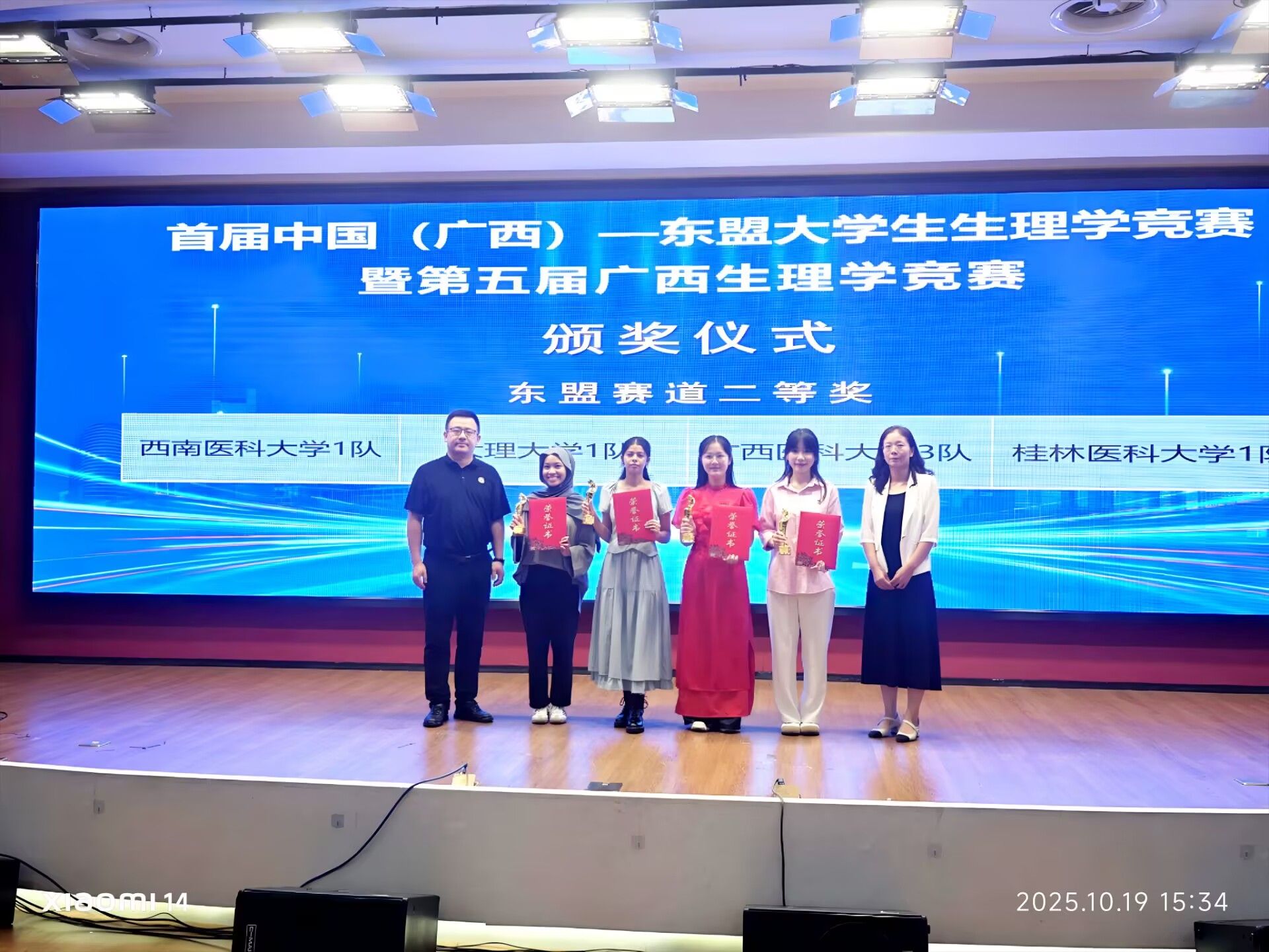 10月19日,由教育部生理学课程虚拟教研室与广西生理学竞赛组委会联合主办、广西医科大学承办的“首届中国(广西)—东盟大学生生理学竞赛暨第五届广西生理学竞赛”在广西南宁顺利落下帷幕。本次竞赛汇聚了来自越南、泰国、尼泊尔、缅甸等8个东盟国家的来华留学生,以及来自中山大学、海南医科大学等国内10余所医学院校的180名参赛选手。中外学子同台竞技,充分展现了医学素养与团队精神,促进了跨文化交流与相互借鉴。