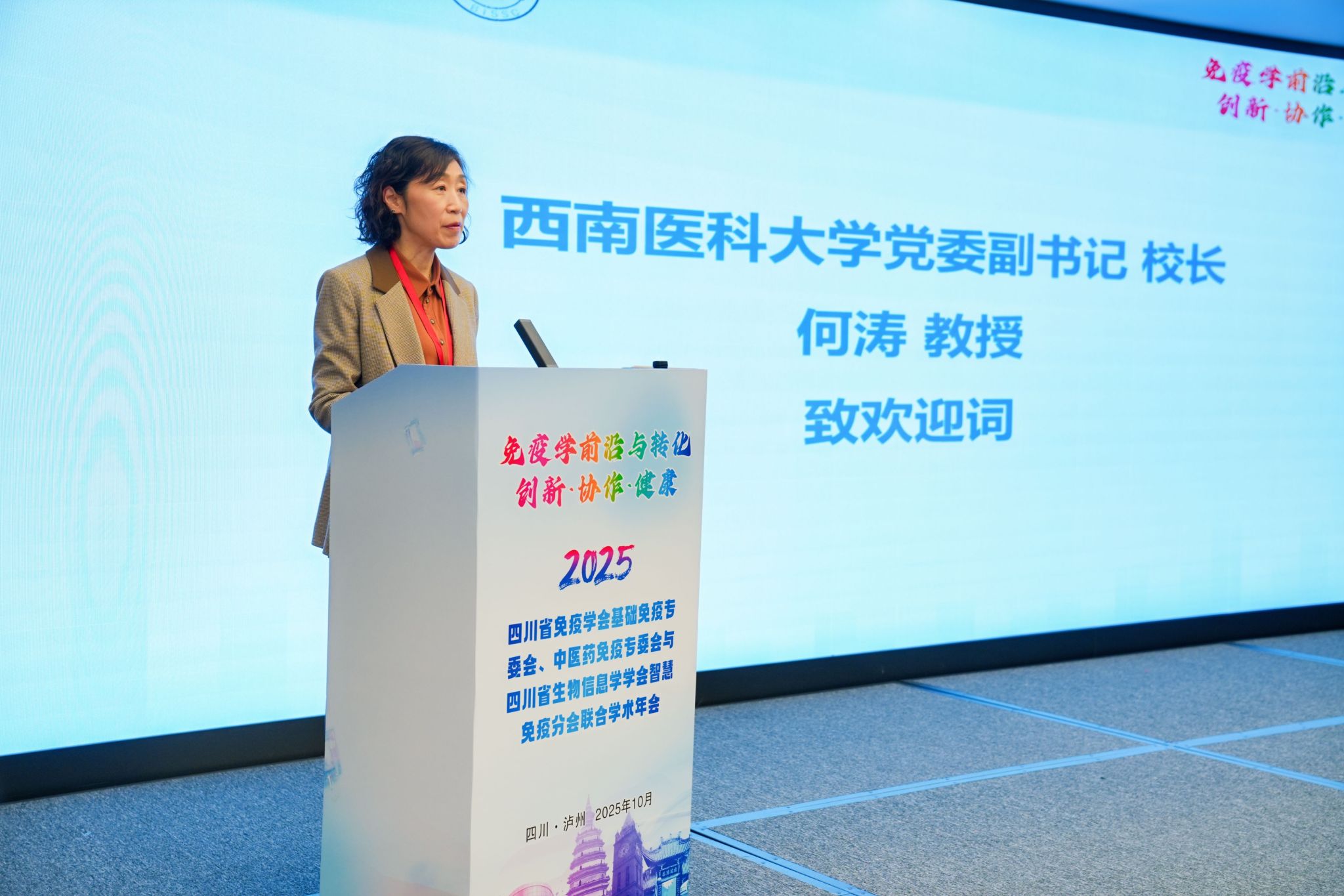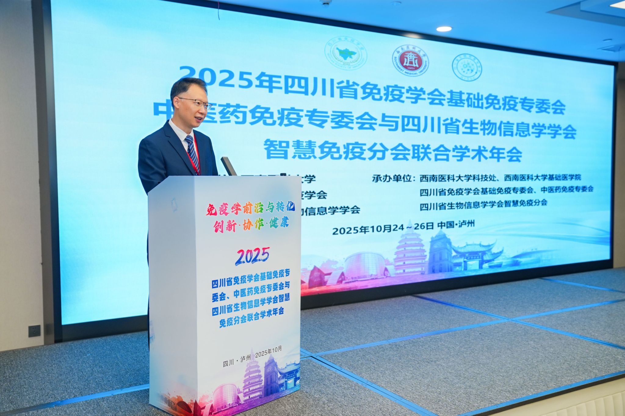 1025日,由beat365官方网站、四川省免疫学会、四川省生物信息学学会共同主办的“2025年四川省免疫学会基础免疫专委会、中医药免疫专委会与四川省生物信息学学会智慧免疫分会联合学术年会在beat365官网学术交流中心(泸州酒城豪生酒店)成功举办。学校党委副书记、校长何涛出席开幕式并致辞,科技处处长吴建明主持开幕式。约200位来自省内外高等院校、科研院所及医疗机构的免疫学、生物信息学及相关领域的专家学者与技术骨干参会。