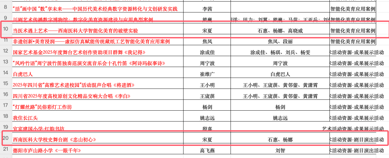 日前,四川省教育厅公布全省2025年度数字化美育资源和智能化美育应用案例入选名单。校团委牵头申报的《beat365官方网站校史舞台剧——忠山初心》和《当医术遇上艺术——beat365官方网站智能化美育的破壁实验》2个项目,经专家论证,分别被认定为优秀“艺术活动资源-剧目演出活动”和“智能化美育应用案例”,并被推荐至教育部国家智慧教育平台。