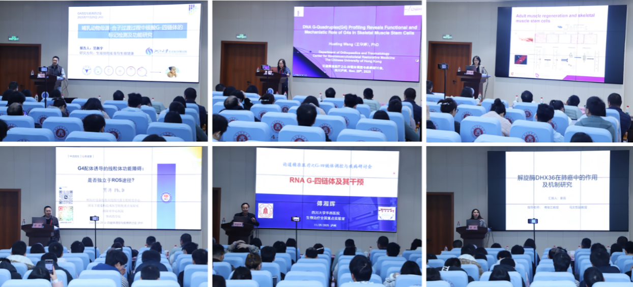 研讨会设“高层次专家学术报告”“青年学者论坛”两大板块,13位专家学者分享前沿成果。高层次专家报告环节,6位专家代表作交流:国家万人计划科技创新领军人才、浙江大学求是特聘教授范衡宇阐述《G四链体稳态调控与哺乳动物早期胚胎发育潜能的建立》;香港中文大学王华婷教授探讨《G-quadruplex Regulation and Function in Skeletal Muscle Regeneration and Aging》;陈小娜博士报告《DNA G-quadruplex profiling in skeletal muscle stem cells reveals functional and mechanistic insights》;绵阳市中心医院/华西药学院贾涛副研究员分享《G4配体诱导的线粒体功能障碍:是否独立于ROS途径?》;四川大学生物治疗国家重点实验室傅湘辉教授主讲《RNA G-四链体及其干预》;澳门科技大学与beat365官网联合培养博士生姜霞代表导师团队,深入探讨《解旋酶DHX36在肺癌中的作用及机制研究》。