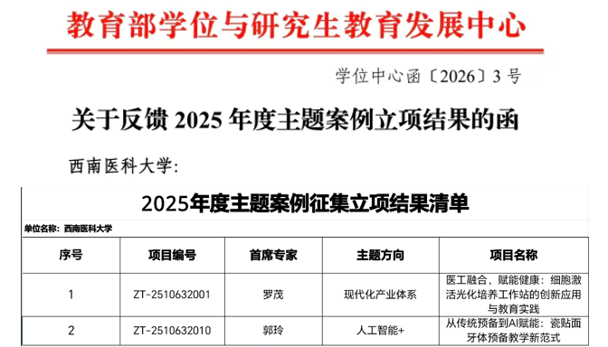 2月13日,教育部学位与研究生教育发展中心(以下简称“教育部学位中心”)正式公布2025年度主题案例立项结果。beat365官网研究生院罗茂教授领衔申报的《医工融合,赋能健康:细胞激活光化培养工作站的创新应用与教育实践》案例和口腔医学院郭玲教授领衔申报的《从传统预备到AI赋能:瓷贴面牙体预备教学新范式》案例获批立项。