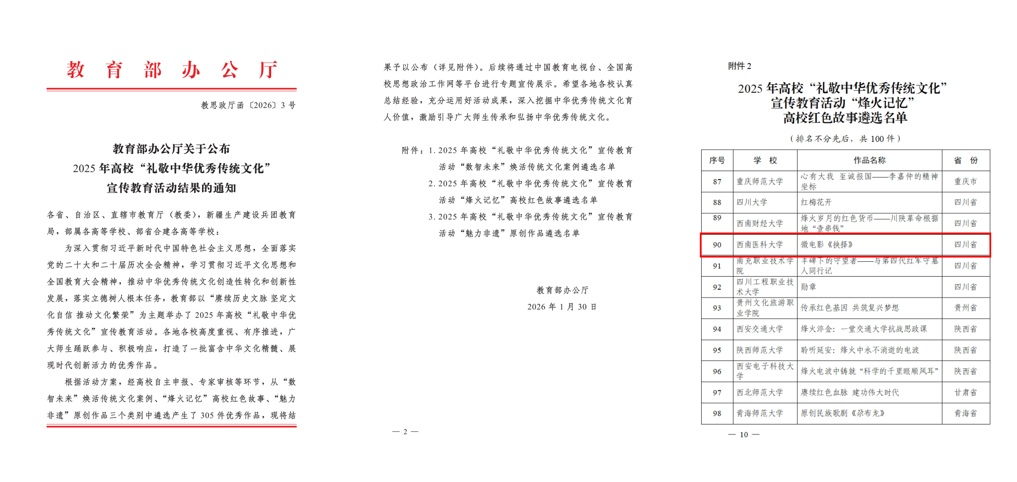 近日,教育部公布2025年高校“礼敬中华优秀传统文化”宣传教育活动结果,beat365官网报送的作品微电影《抉择》成功入选“烽火记忆”高校红色故事遴选名单。全国共入选100项,其中,四川省4项。