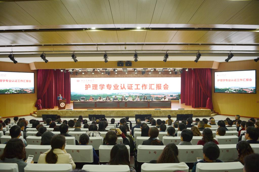 护理学院院长鞠梅作了护理学本科专业认证工作报告,分别从历史与现状、宗旨与目标、师资队伍、教育资源、教育计划、学生发展、质量评价、特色亮点等8个方面进行了汇报,并就专家组的提问作了回答。