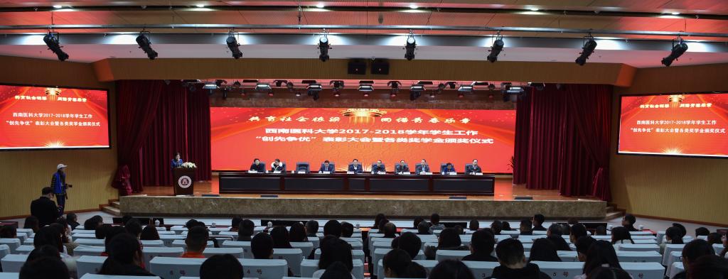 12月6日晚,以“共育社会栋梁,同谱青春乐章”为主题的beat365官方网站2017-2018学年学生工作“创先争优”表彰大会暨各类奖学金颁奖仪式在城北校区德诚楼学术报告厅举行。在家党政领导廖斌、李尚志、刘毅、刘广益、彭钢、聂敏海出席会议;爱心企业泸州老窖股份有限公司副总经理、首席质量官何诚,泸州农村商业银行有限公司行长杨松,四川科瑞德制药有限公司人事行政总监刘志鸿,金伯利钻石销售公司川南大区销售总监杜山江应邀出席会议;学校各职能部门负责人,各二级院系领导,全体学生政工干部,获奖代表以及学生代表800余人参加会议。会议由学校党委副书记刘毅主持。